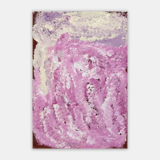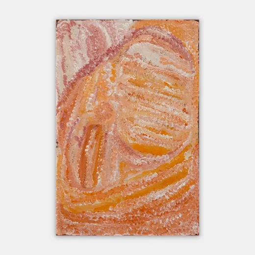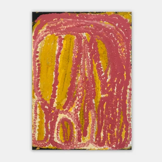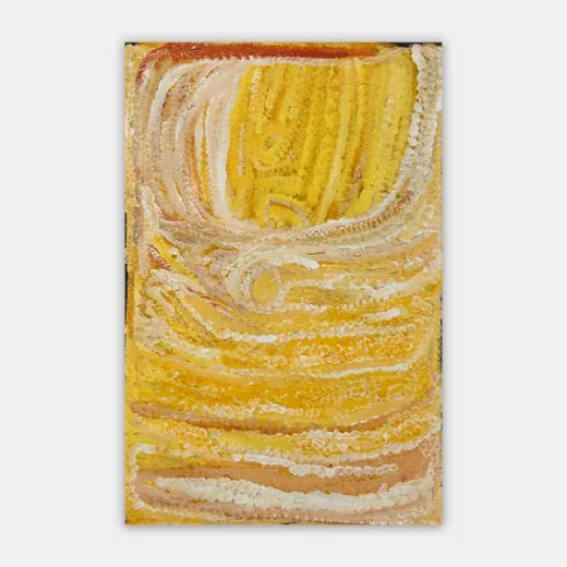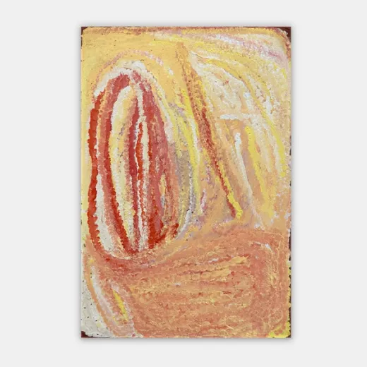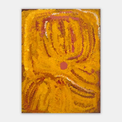 Eubena started painting with her second husband Wimmitji in the mid 1980s. Their work shared a luminous and intricate complexity along with a love of the warm reds, oranges and yellows that continued to be Eubena’s signature palette. Eubena’s reputation grew, as one half of the famous painting duo at Balgo, but also as a solo artist in her own right. Eubena had a spontaneity and strength of brush mark that carved the paint, leaving rhythmical tracks across the canvas. Her work resonates with the power of place and intimate knowledge of country that Eubena was able to maintain throughout her life. Painting was like her second language and she painted persistently with passion and dedication, weaving stories from the Tjukurrpa (Dreaming) as well as her personal history and knowledge. Throughout her painting career, Eubena travelled extensively to attend exhibition openings around the country.