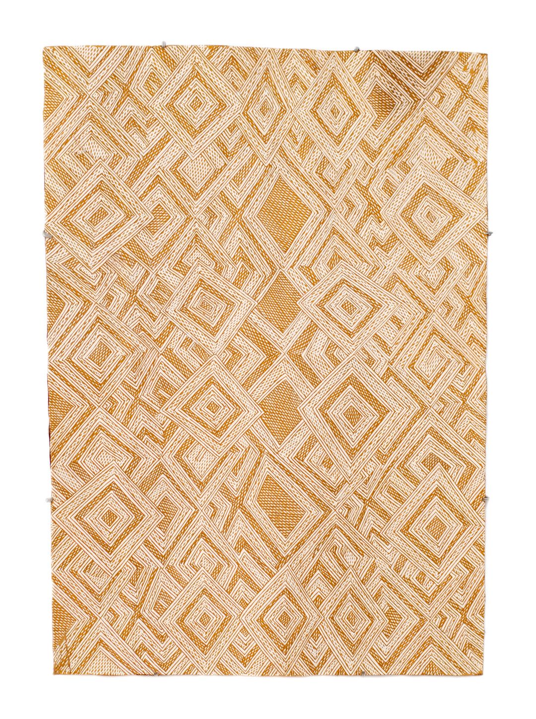Wanambi extends the history and practice of Yolŋu painting. Whilst continuing to use natural pigments and rarrk (crosshatching), he extends the possibilities of these methods through the mixing of natural pigments to form unique colours and deliberate tonal variations. His precise geometry and complex layering of designs create a depth of field on an otherwise flattened surface and a mesmerising optical effect.