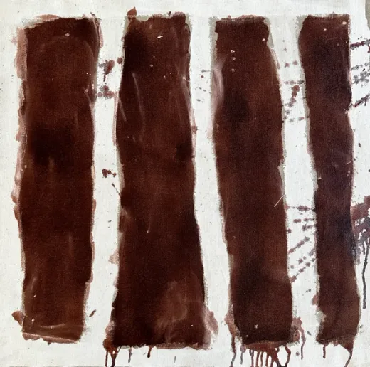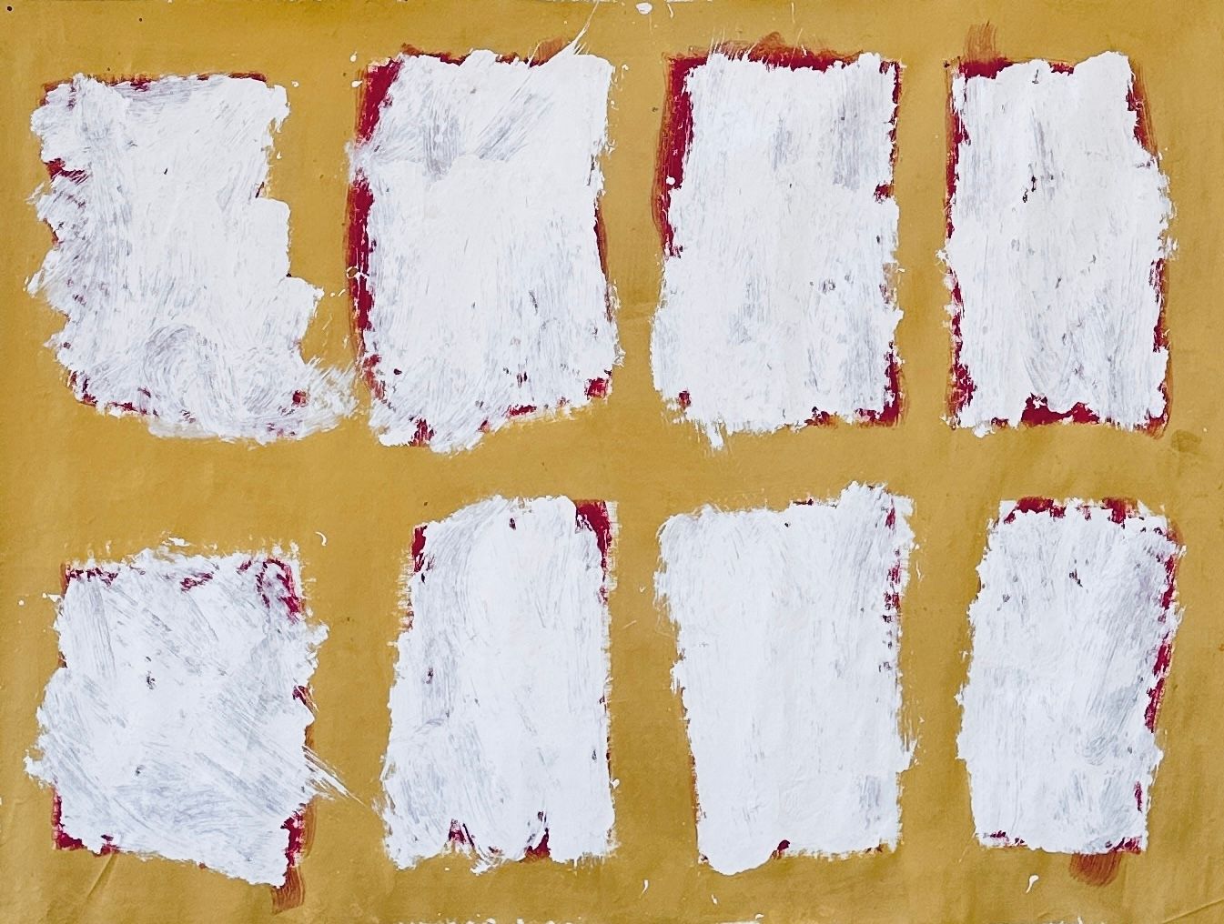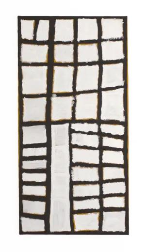 Born in 1990, Marcus Camphoo Kemarre, aka, ‘Double O’, is an Alyawarr man living between Ali Curung and Tennant Creek. He paints at both Arlpwe Art and Culture centre in Ali Curung, and at in Tennant Creek at Nyinkka Nyunyu Art and Culture Centre with the men's collective, The Tennant Creek Brio. Marcus works with oil on linen, sometimes on boards, with large abstract grids. His contemporary style is powerful and minimalist which expresses his mystical and other worldly personality. Marcus’ work is intriguing in how he intuitively alludes to other dimensions within the work. His structures and portals continue beyond the two dimensional support.