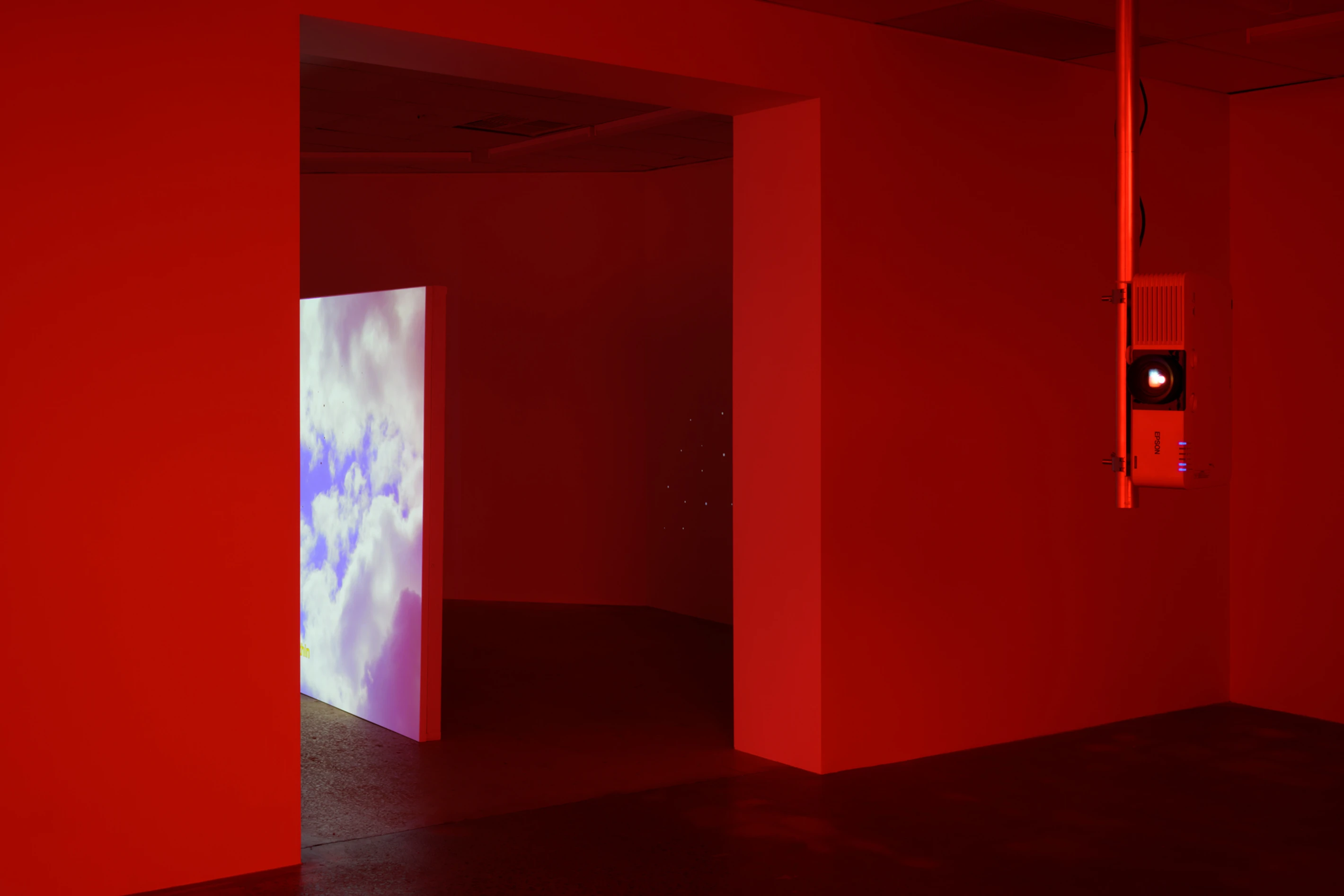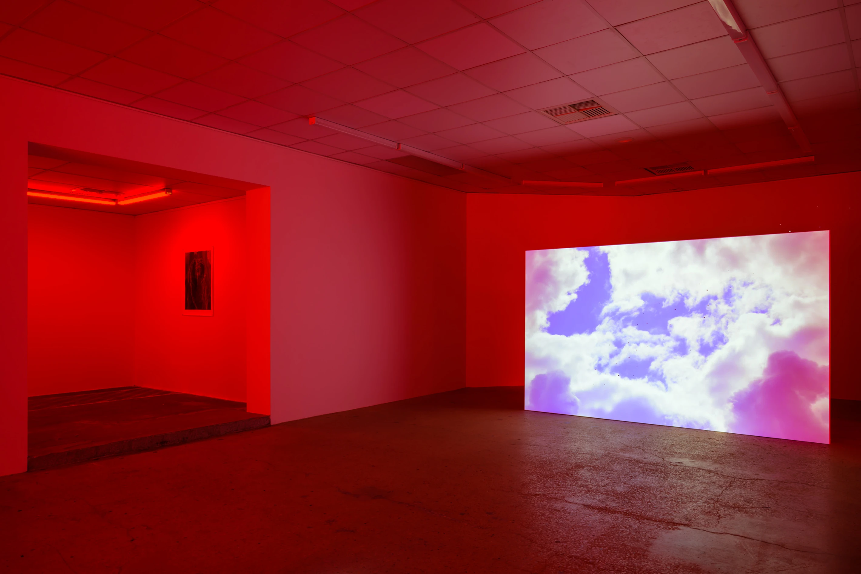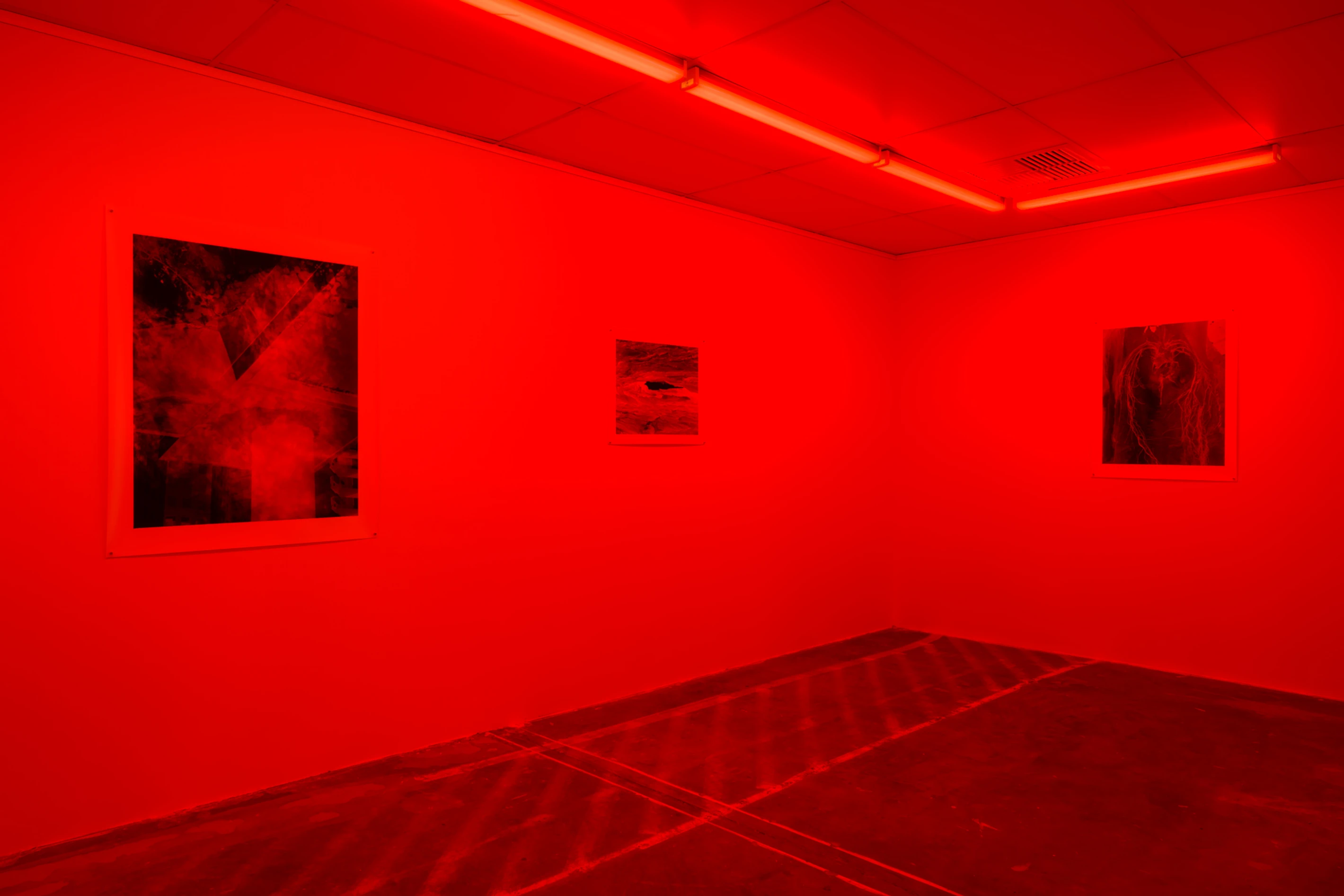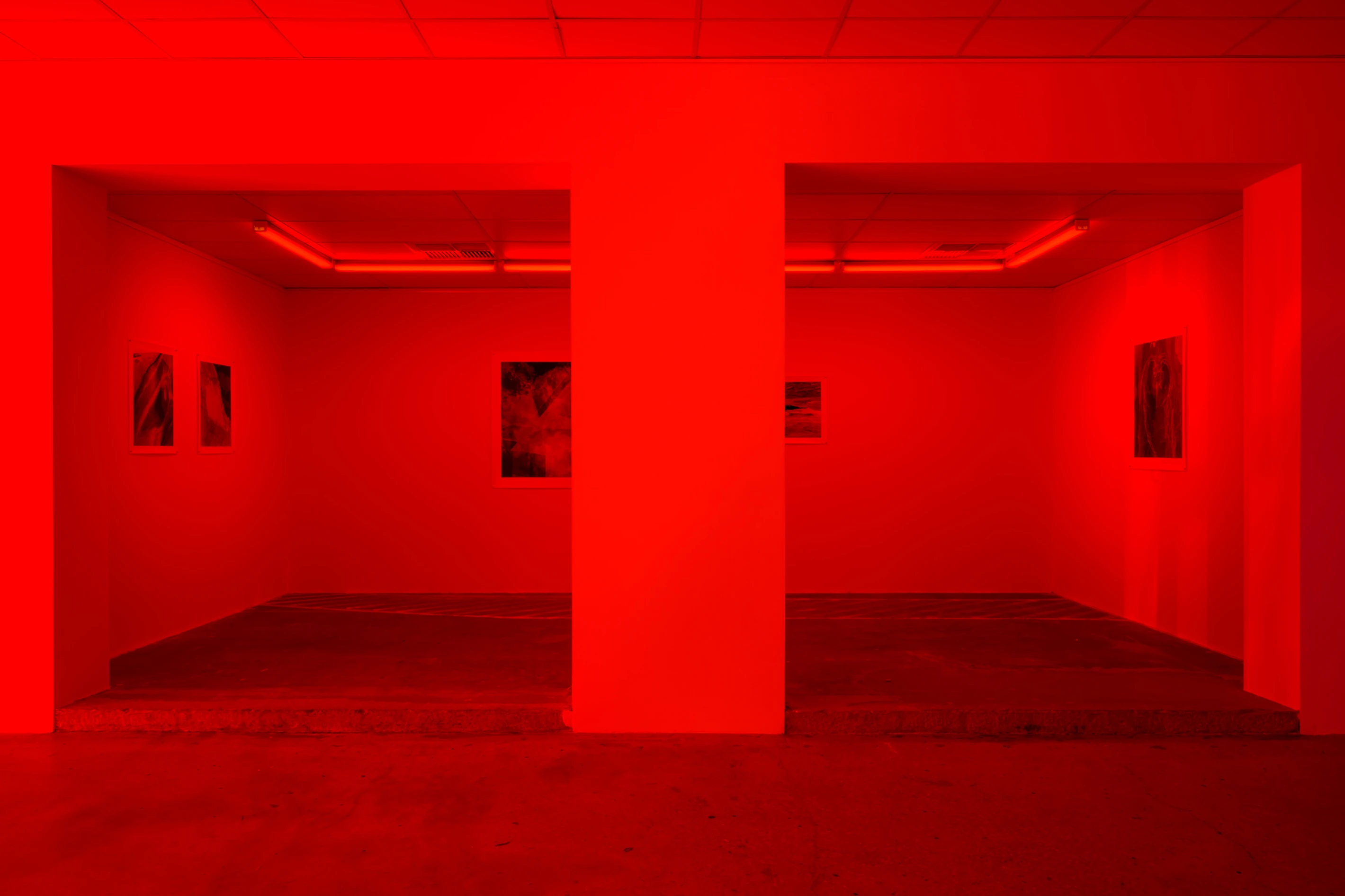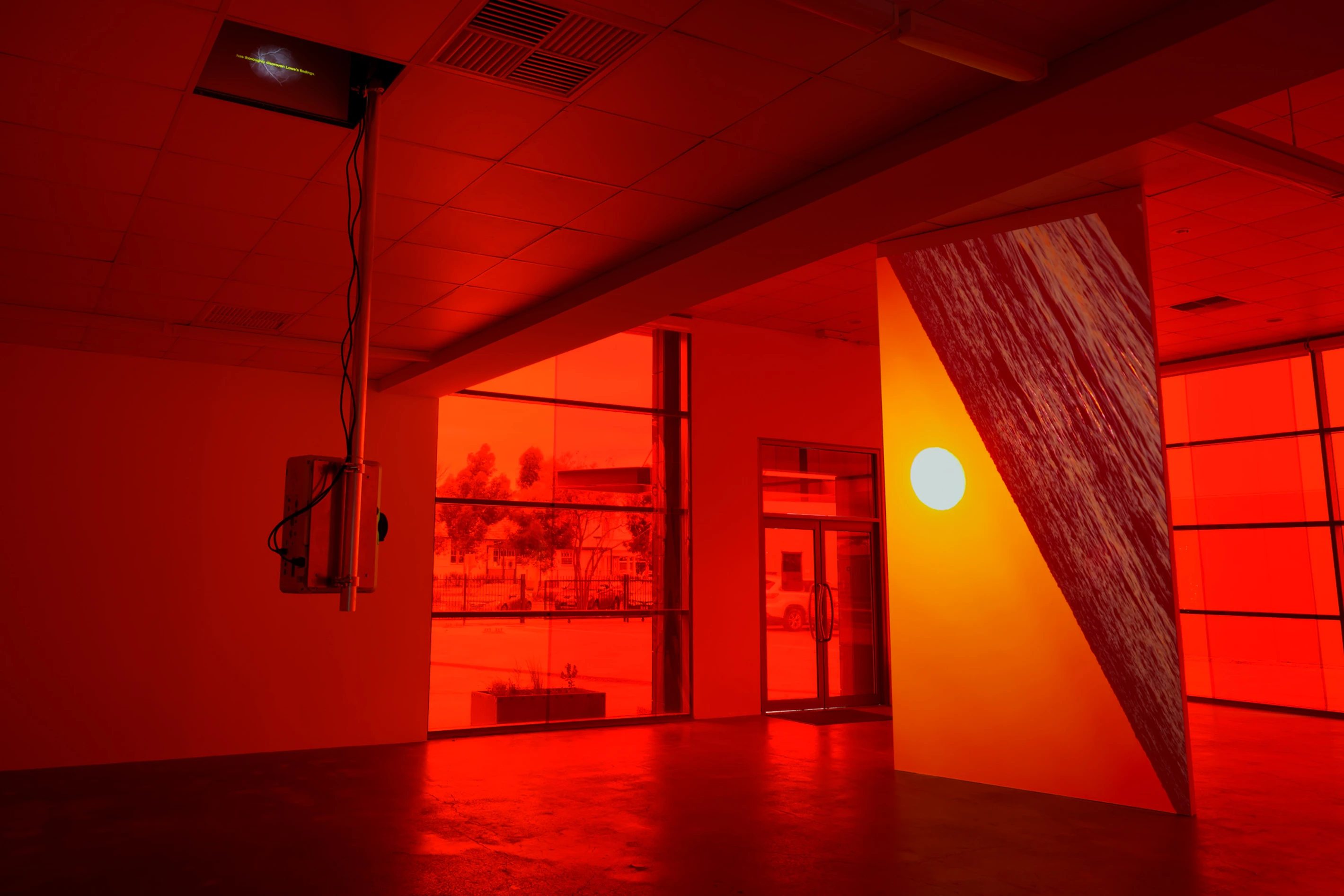 The large gallery windows throughout NAP contemporary are covered with photographic gel’s, immersing the space in a red spectrum of light, affecting the vision of the viewer. This illustrates the effect on the human eye, which “white balances,” once you leave the gallery or encounter daylight.