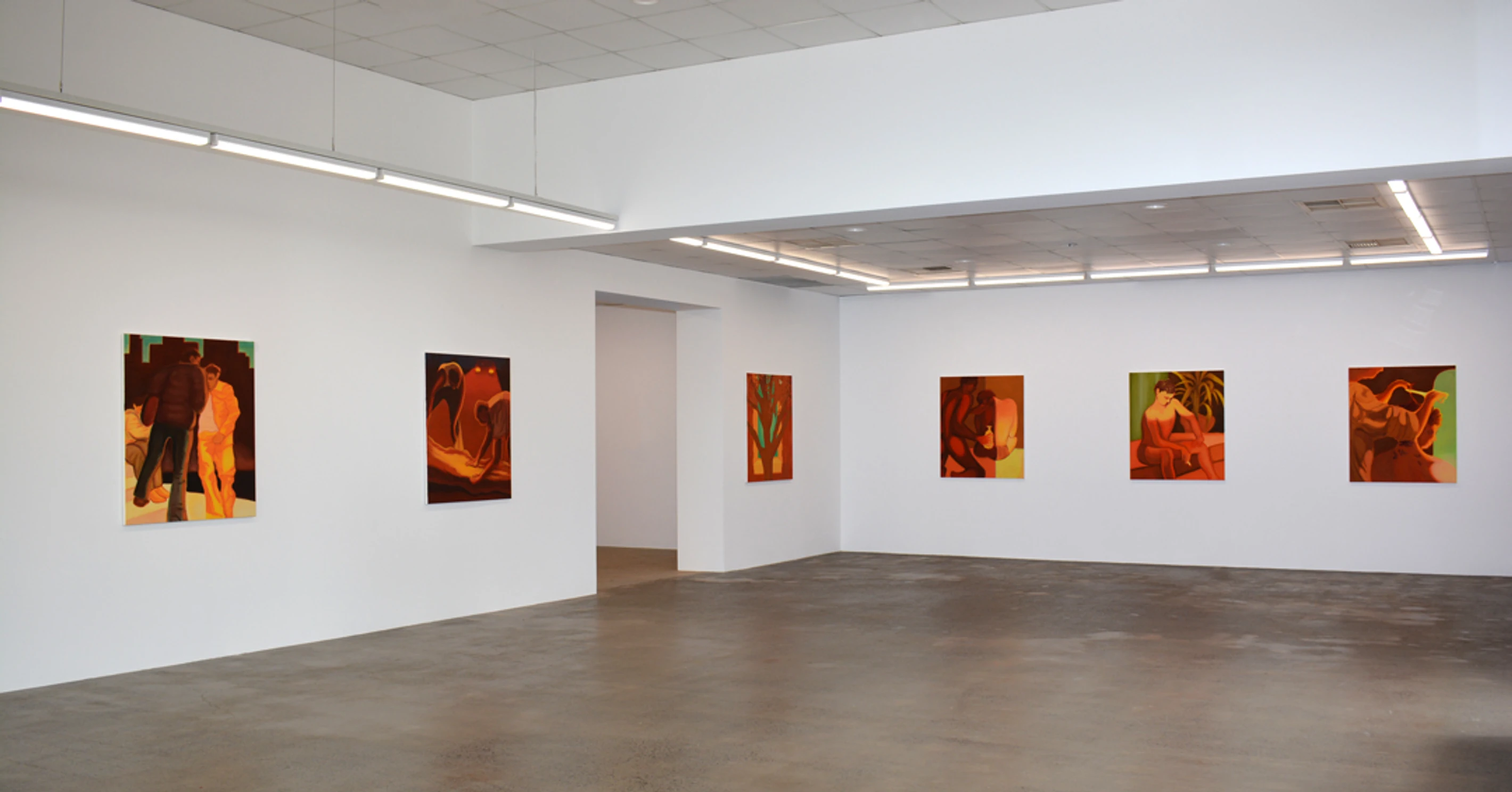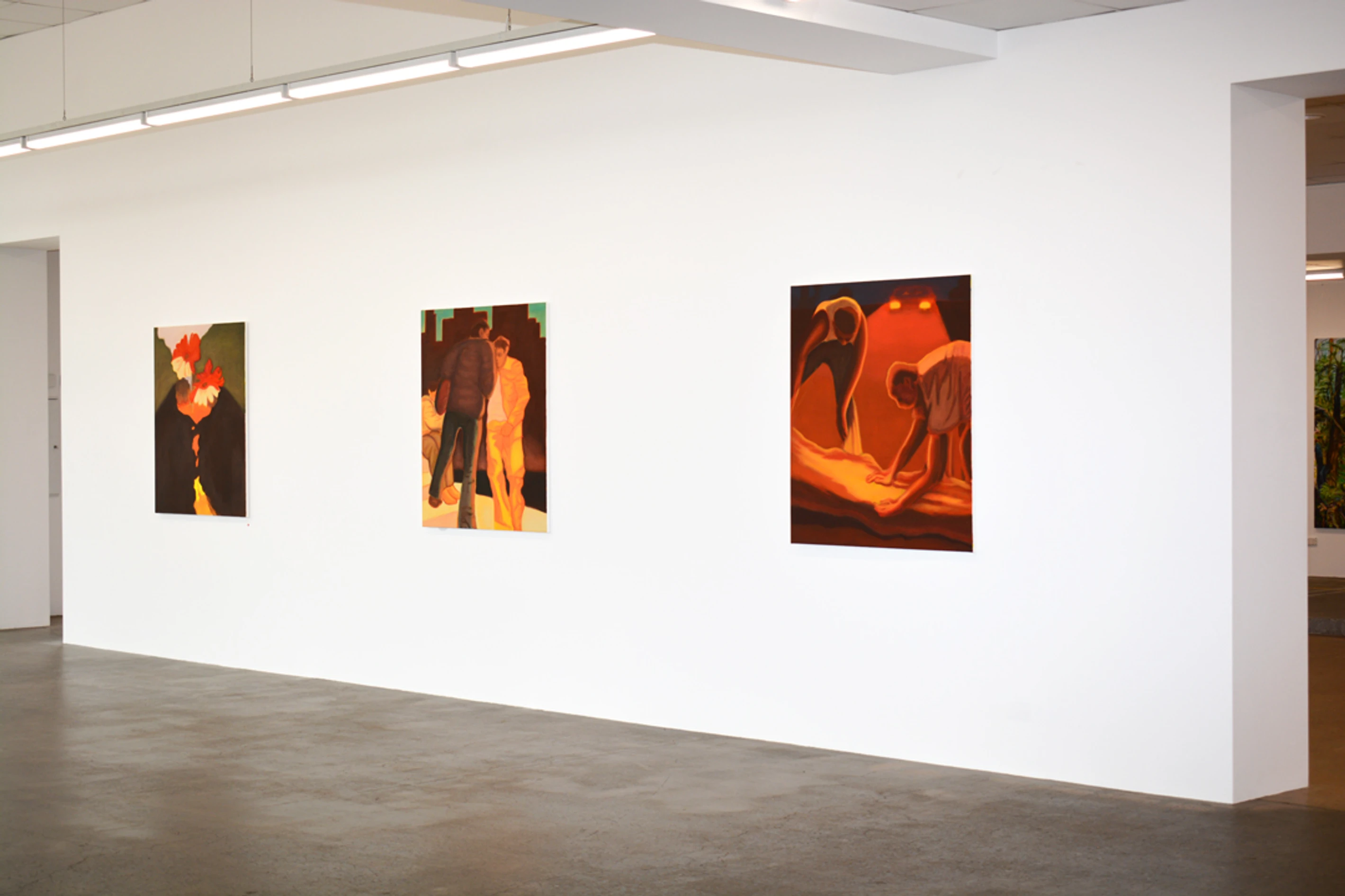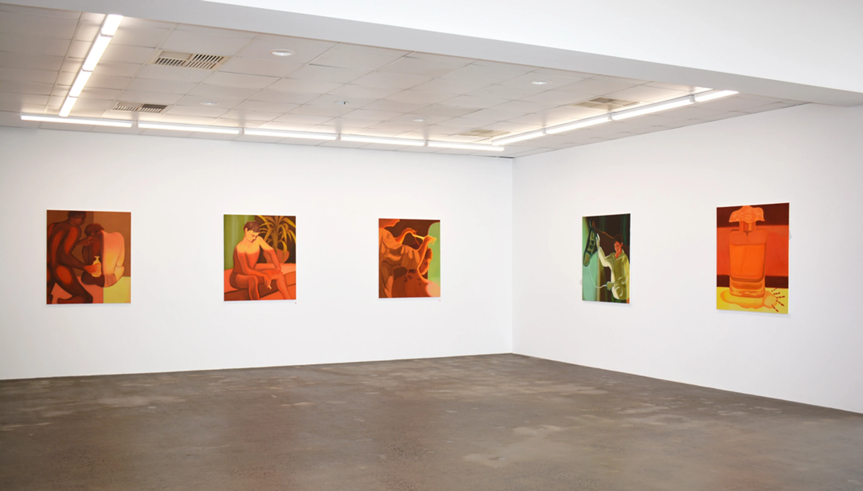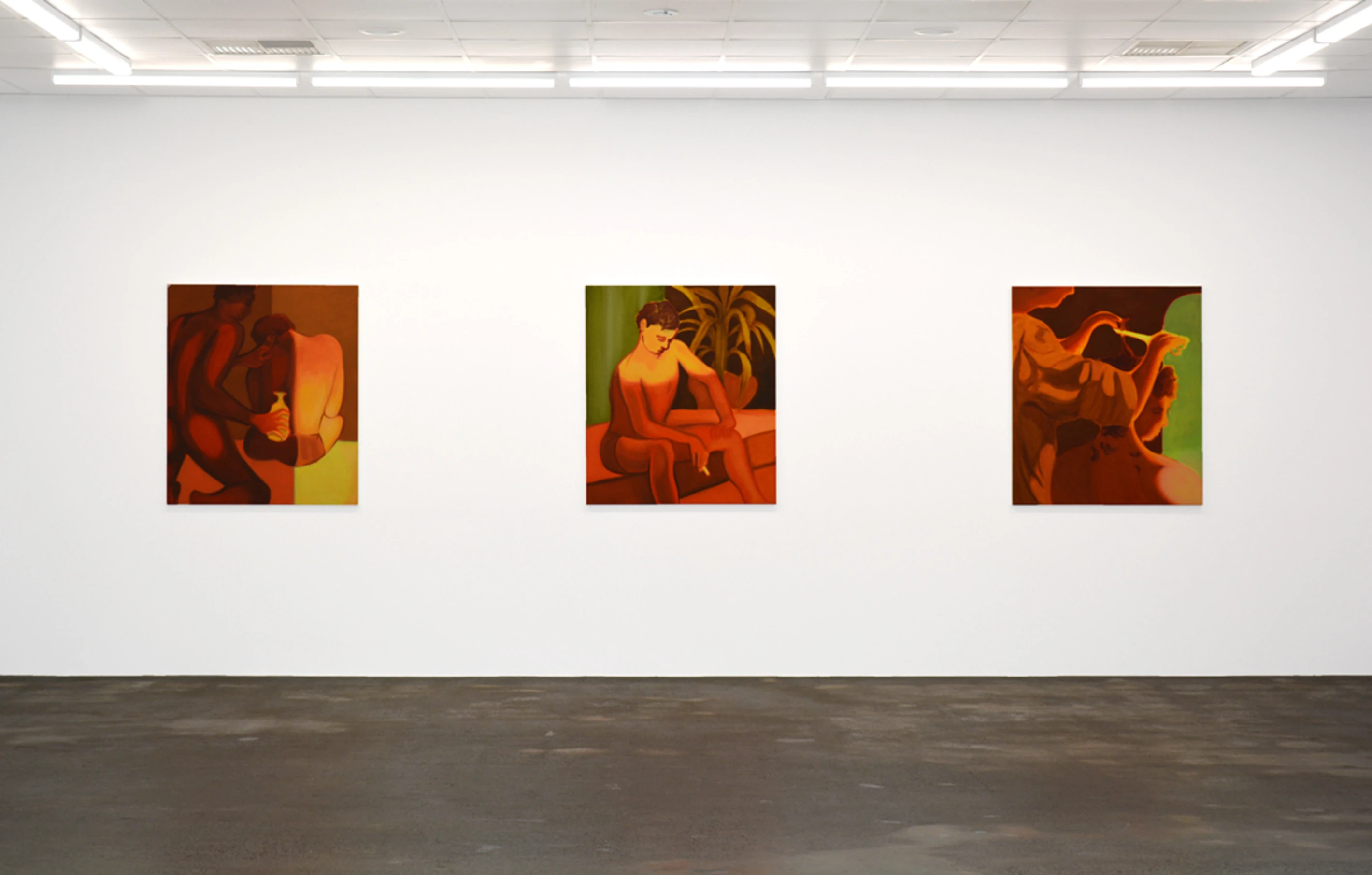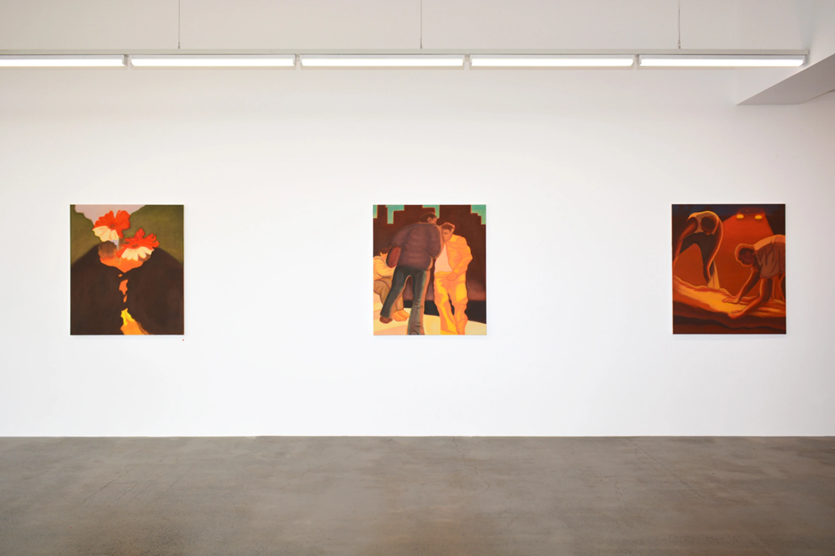 Hot Hot Hot presents nine large oil paintings by Nick Mullaly. Titled after The Cure song of the same name, the works in Hot Hot Hot merge melancholic eroticism with uncanny scenes, each one encased in an amber glow. The work engages a kind of gleaning: cursory sketches, notes, and references to cinema have been layered to create mysterious and contemplative images.