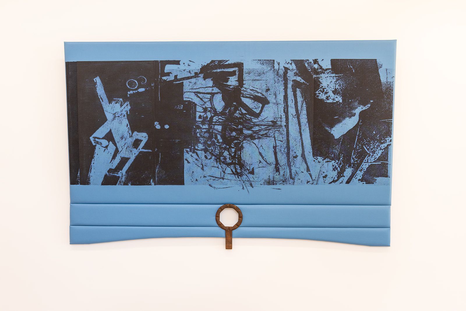Peters’ Beirut by the Bay (2023) is a large wrapped vinyl diptych. The top half is screenprintedwith a drawing the artist made using bitumen along with distorted found images, and tilts away from the wall to impose on or even cocoon the viewer. This tilt is achieved through Peters’ novel hanging mechanism of attaching crowbars to the backs of her paintings, which then hang off screws in the wall—as if the painting is poised to remove the very hardware that supports it in a gesture of self-erasure. Here, the crowbar hanging mechanism also gives the large rectangular painting the impression of a popped bonnet or car boot.