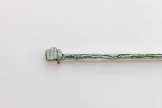 Several of the works in Mildura Atrocity Exhibition channel the latent violence of the car, though in slightly different ways to Crash. Burrow’s scratch Negative content (2023) speaks to the history of improvised weapons and prosthetics: of growing up being told to wedge keys between her fingers when walking home late at night. The scratch is an elemental expression of the subject, like the handprint or petroglyph, but it’s also a classic form of vandalism against private property. Negative content is installed low on the wall below waist-height, to indicate surreptitious execution.