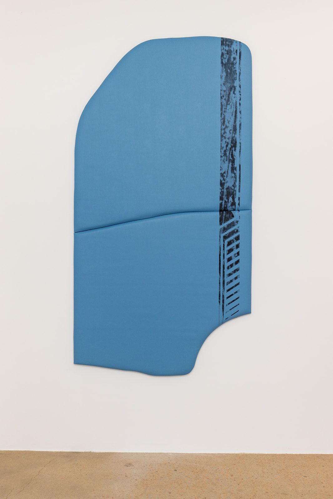 The Subaru Forester series connotes the shaped canvases of Kelly or Stella, but departs from these investigations into colour and shape through the use of the nontraditional material of vinyl in lieu of canvas. Peters does not apply pigment to the surface of her paintings in a humanistic way, but rather uses the materials and means of mass industry. She screenprints imagery onto prefabricated imitation leather that she has selected from thick colour swatches that lie around her studio. The seriality of the doors, which morph subtly in each new generation of the Forester, similarly connote mass production. Against a logic of a unique subjectivity that is indivisible from the painting, what Isabelle Graw would describe as its ‘liveliness,’ Peters instead speaks of her works’ capacity to be wiped clean—to be fingerprint-less, to completely remove the artist’s hand. This wipe-downability explains the prevalence of materials like vinyl in hospitals and the taxis, which require constant sanitisation.