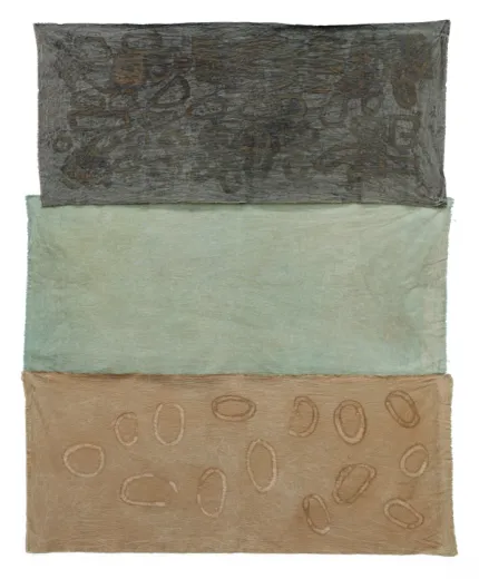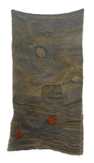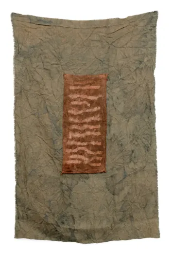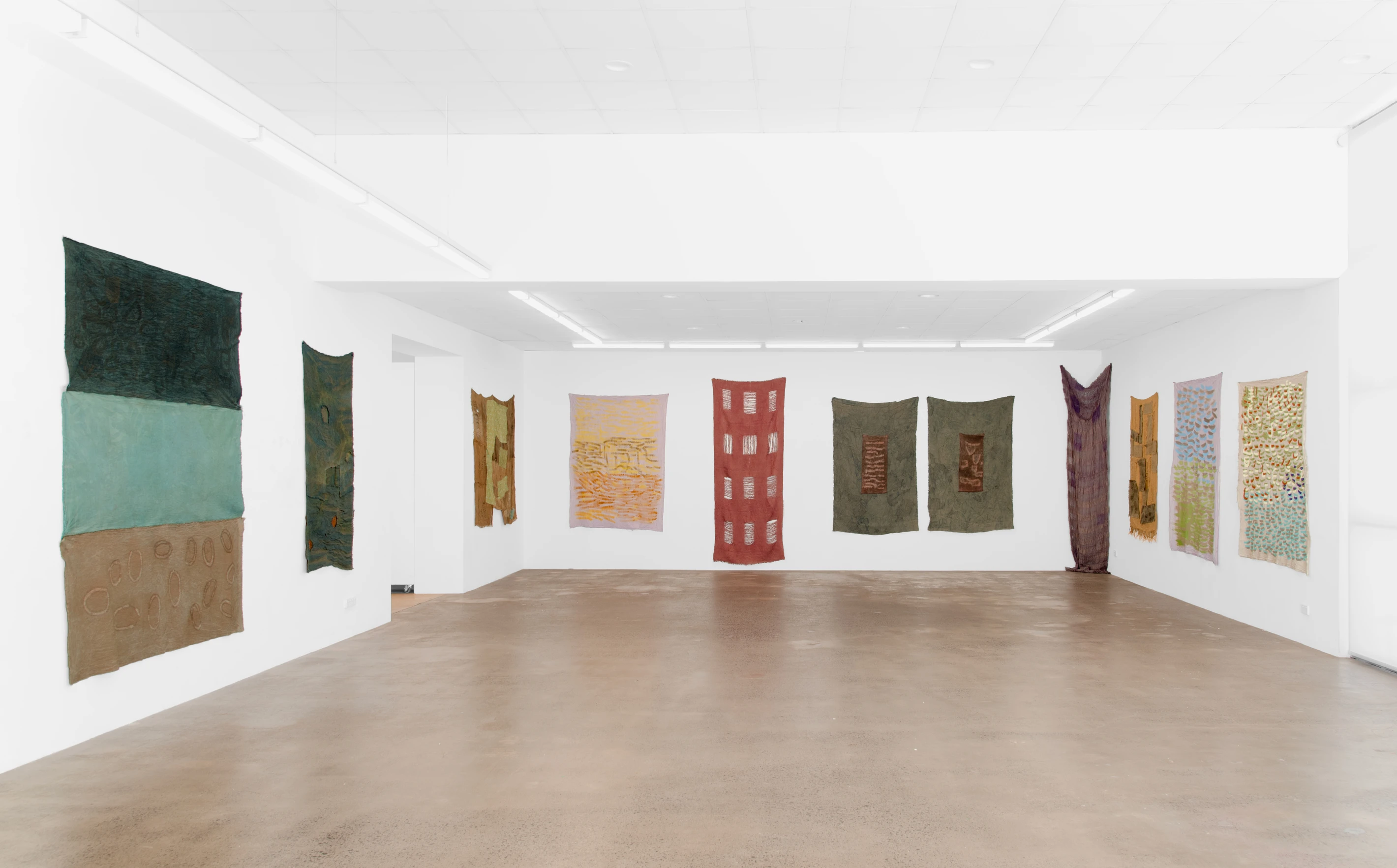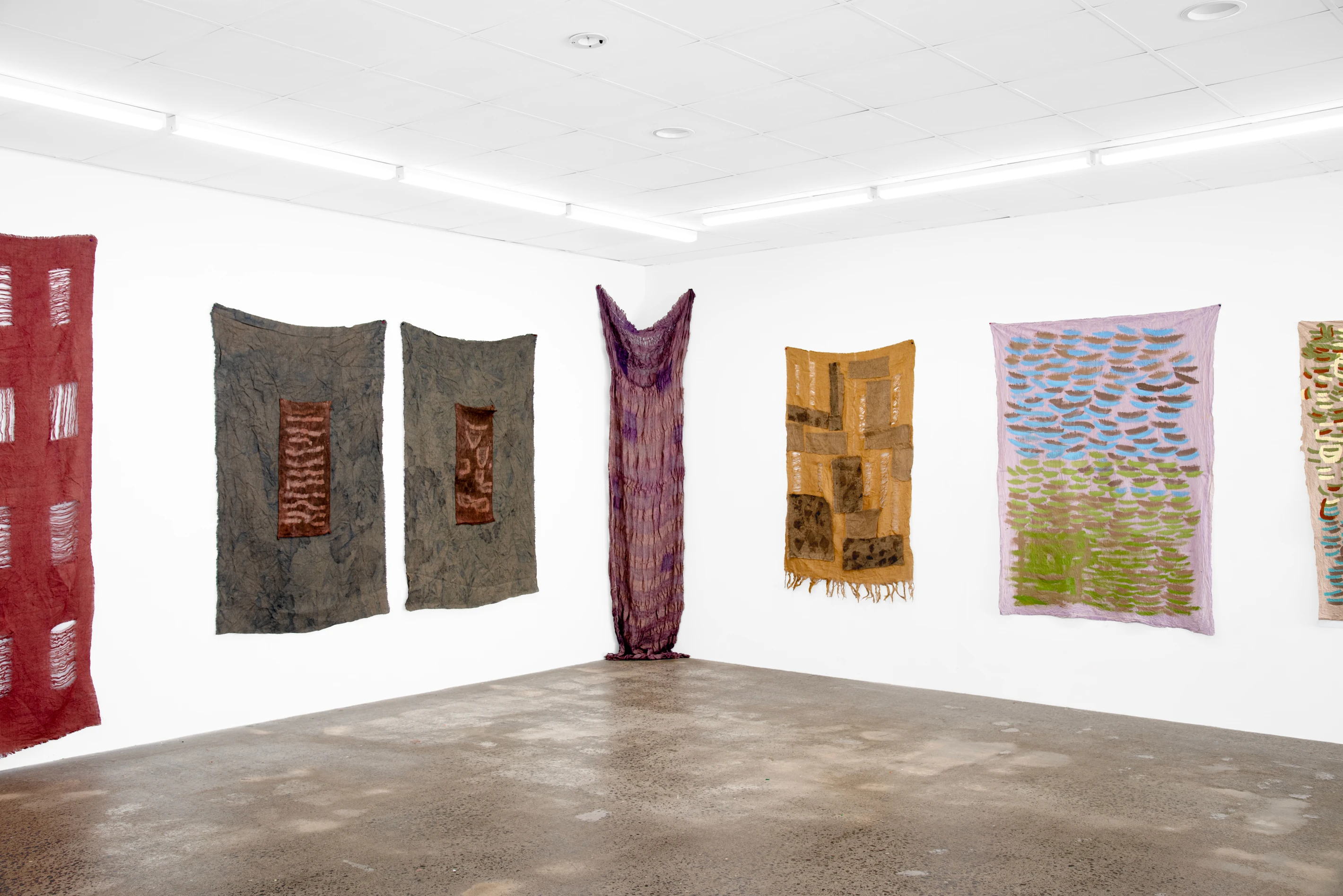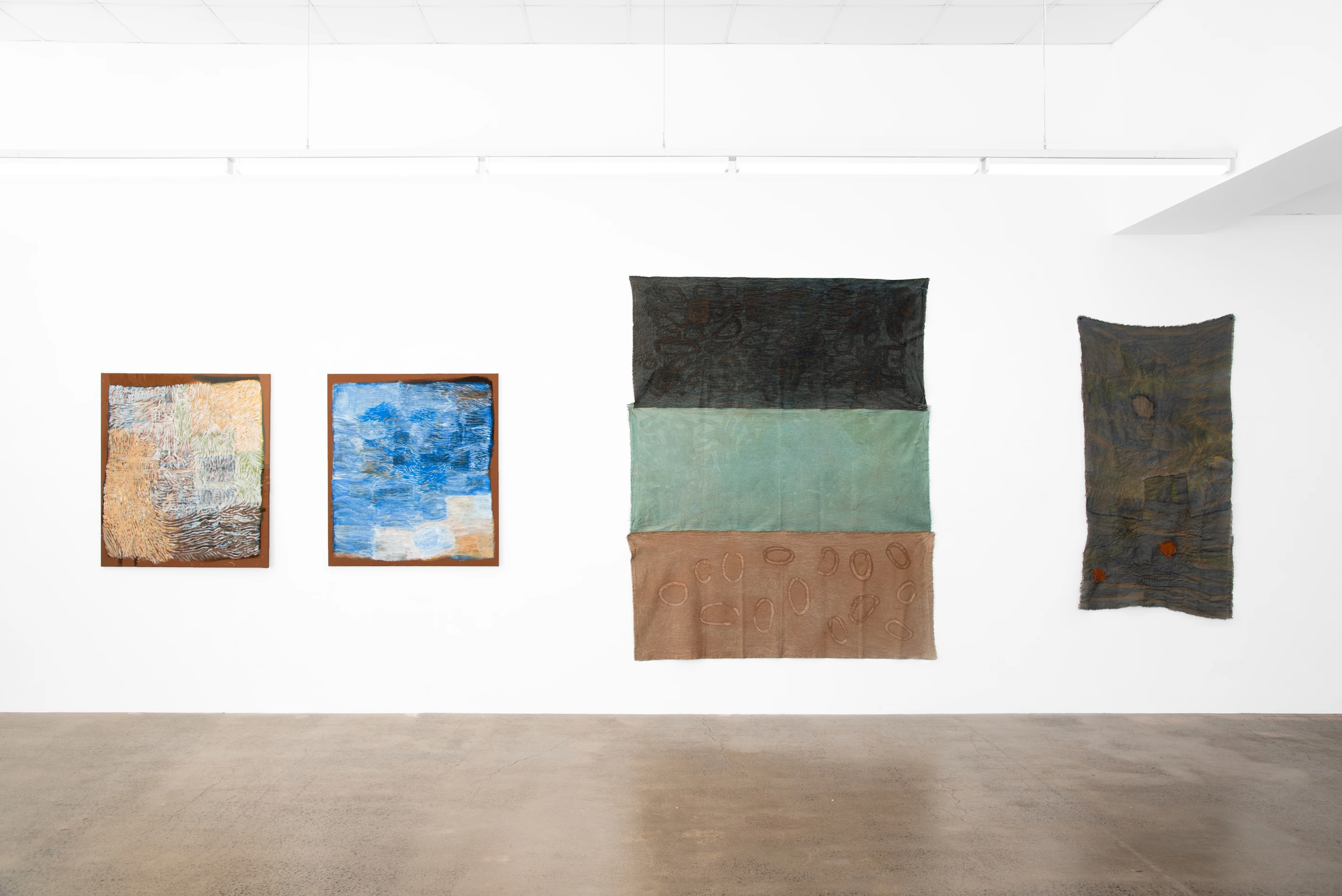 Mungily the Walmajarri word for samphire, a desert plant whose seeds form the raw materials for traditional damper, is the inspiration for an exhibition which explores various modes and materials (beeswax, found clothing, polymer paints, ochres, hessian) which Nampitjin harnesses into a unconventional exploration of symbology, landscape and storytelling, utilising collage, applique, and and reductive processes.