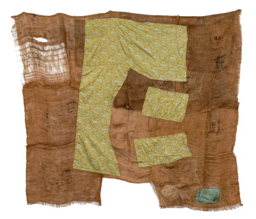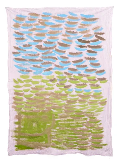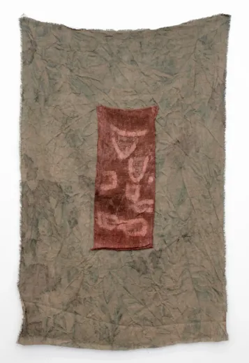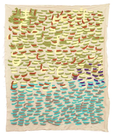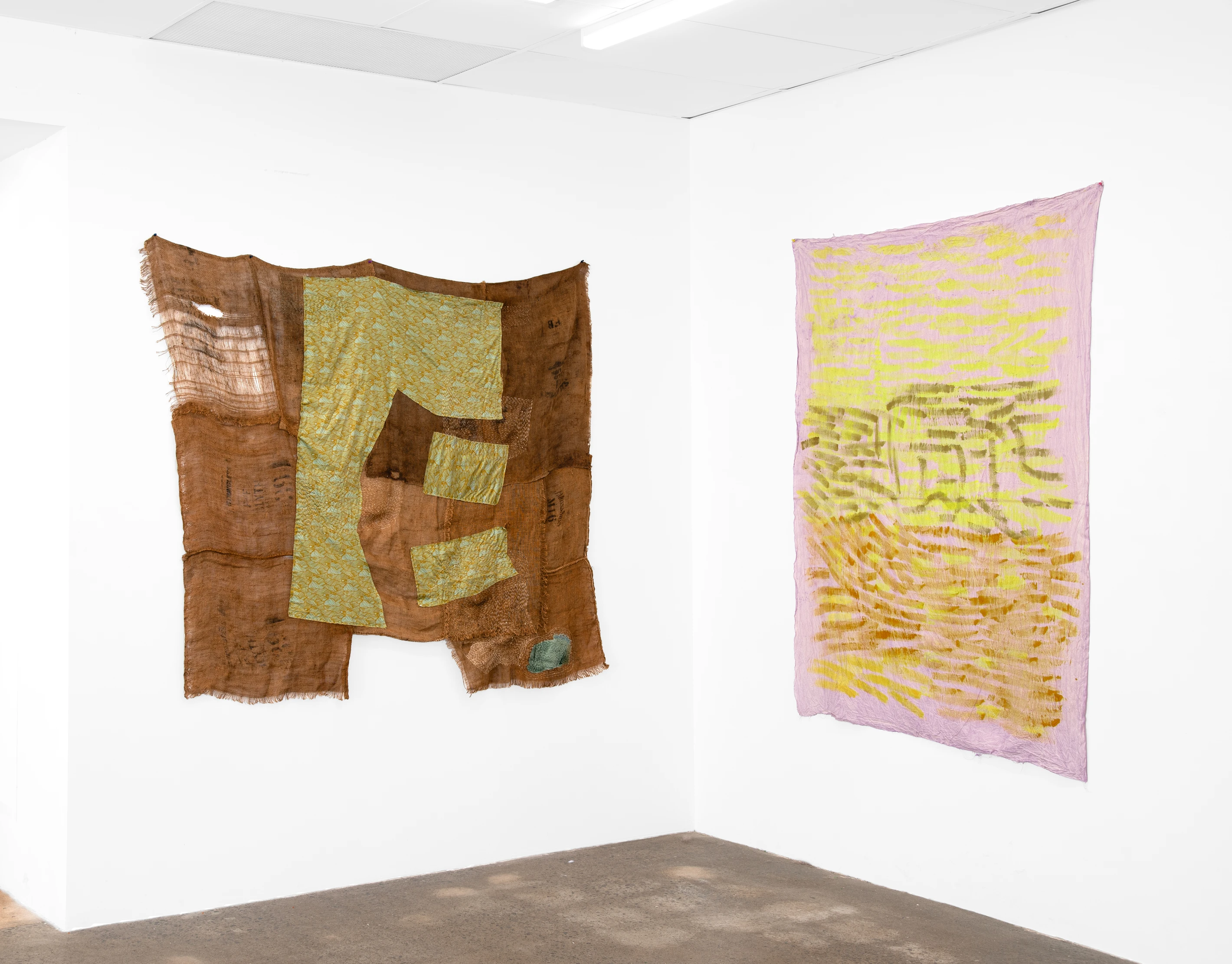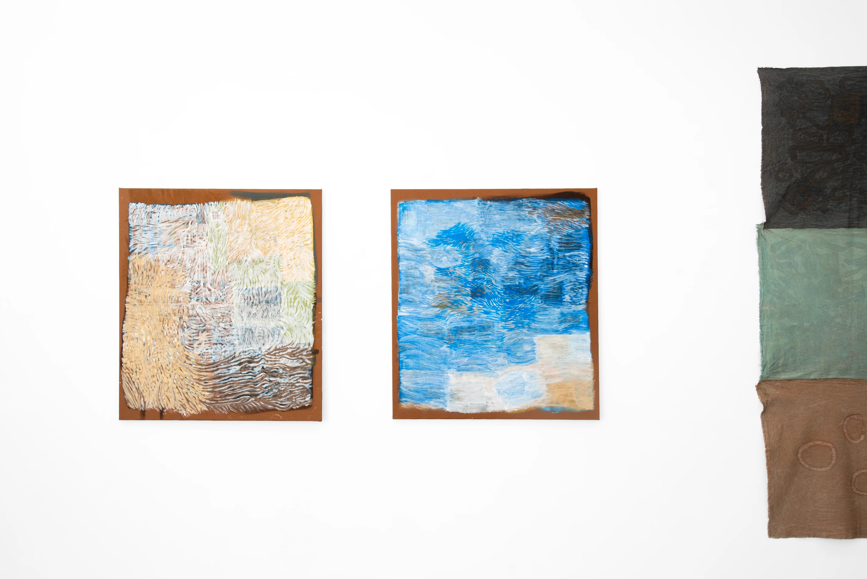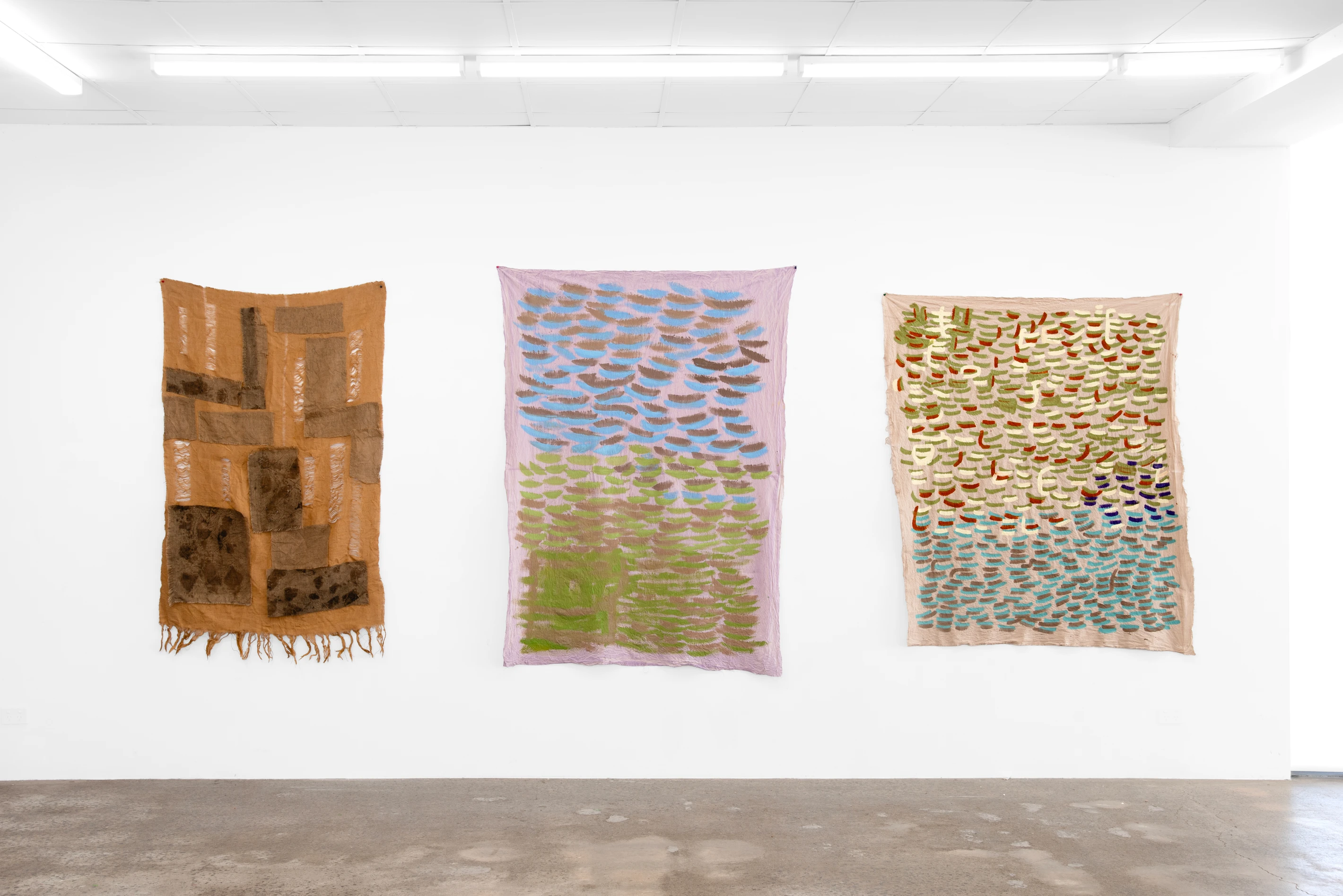 Mungily the Walmajarri word for samphire, a desert plant whose seeds form the raw materials for traditional damper, is the inspiration for an exhibition which explores various modes and materials (beeswax, found clothing, polymer paints, ochres, hessian) which Nampitjin harnesses into a unconventional exploration of symbology, landscape and storytelling, utilising collage, applique, and and reductive processes.
