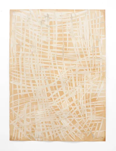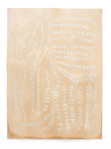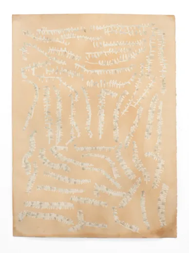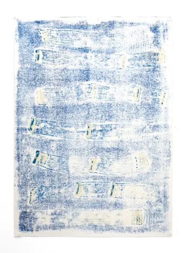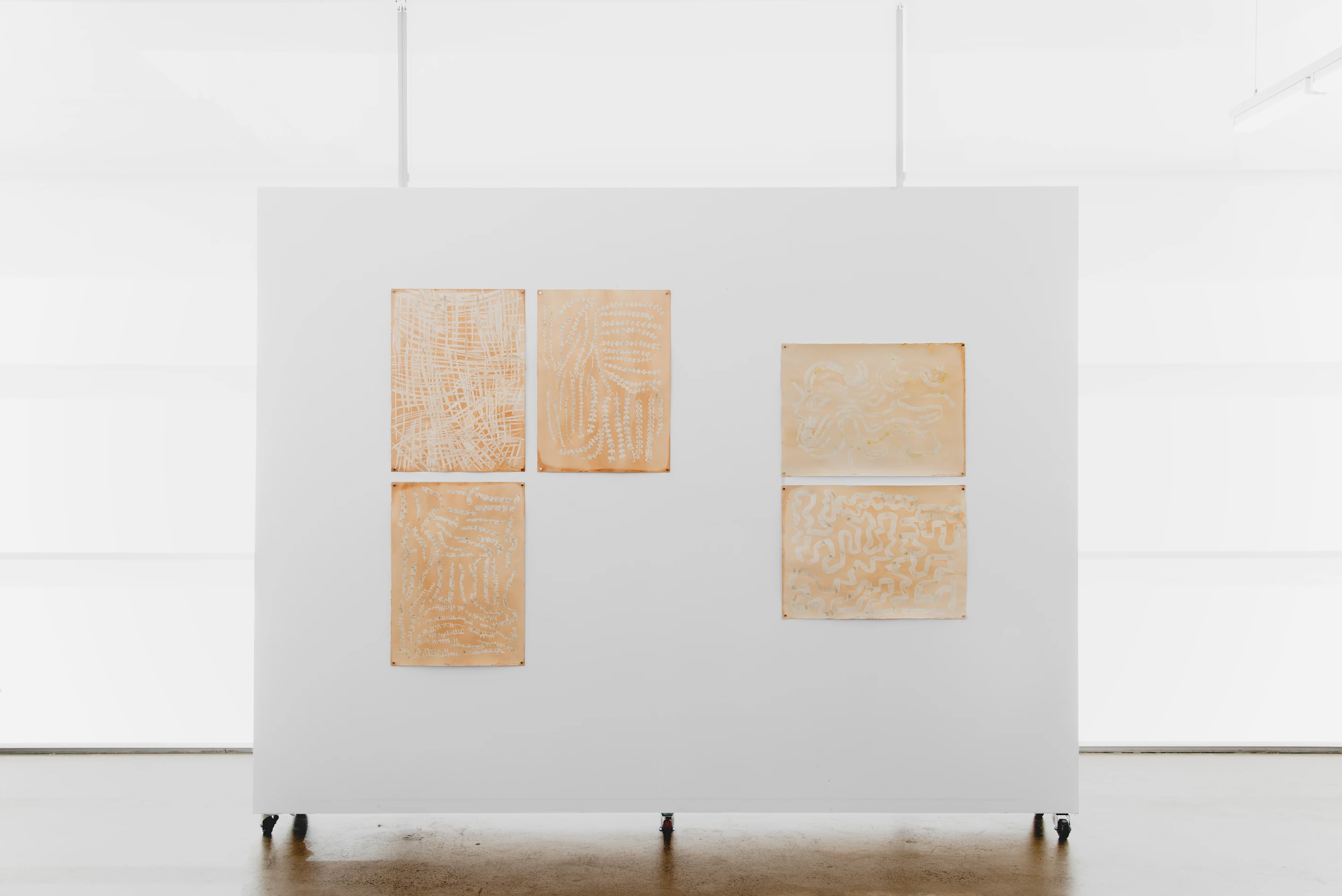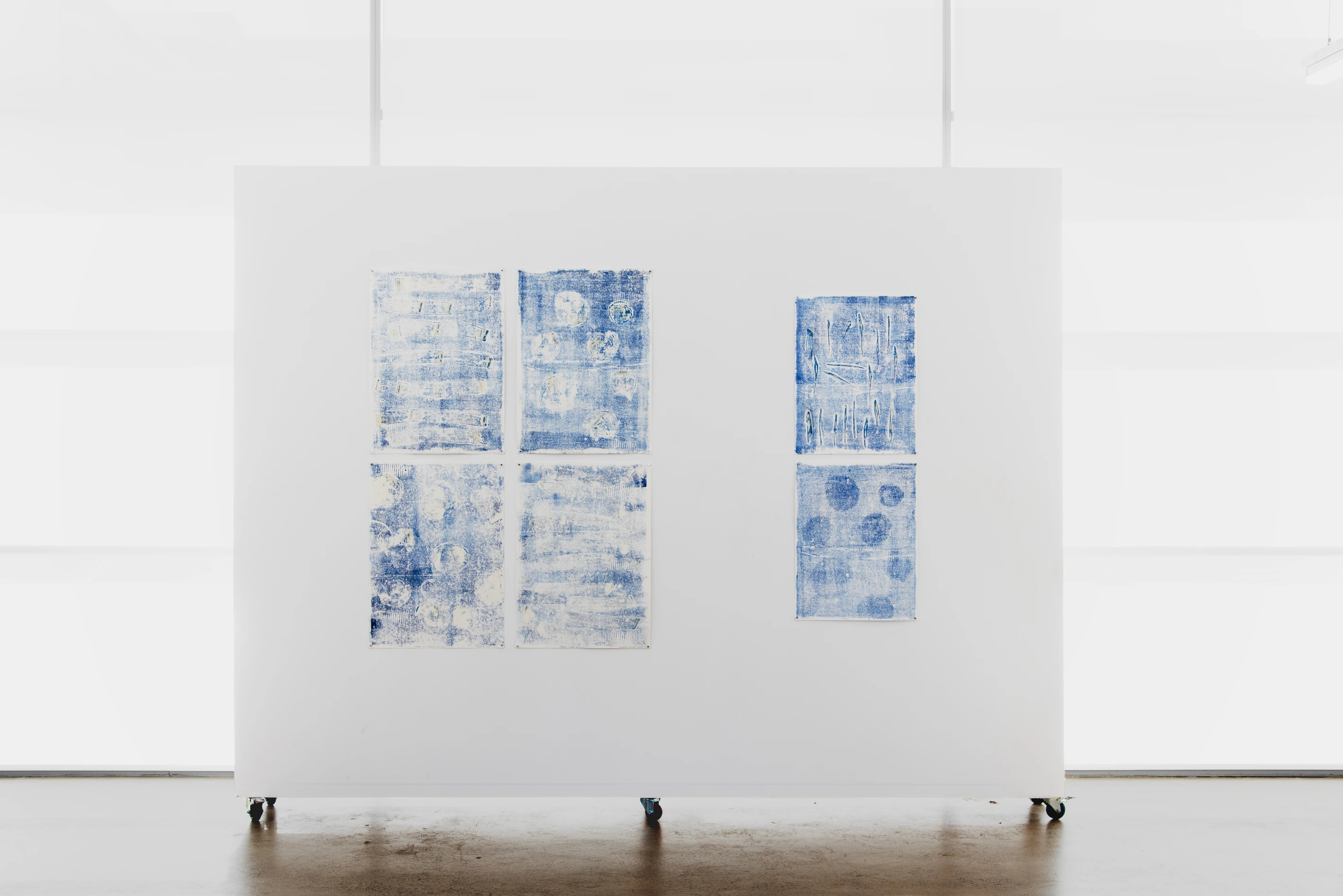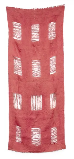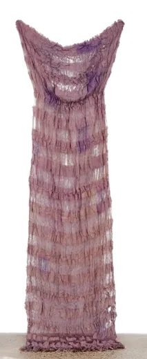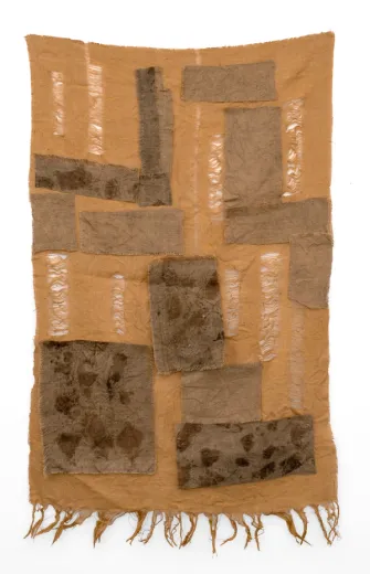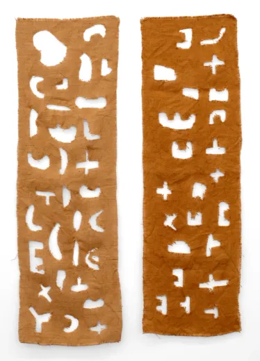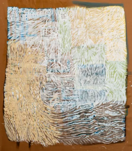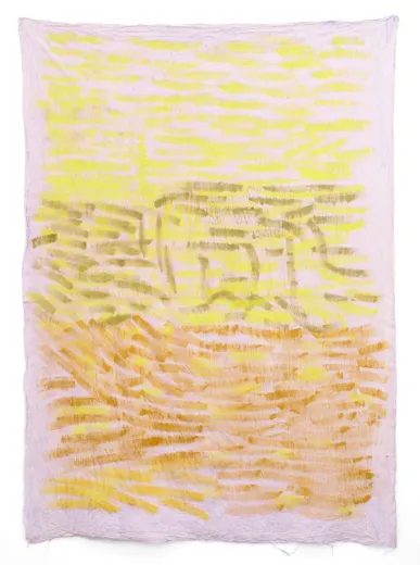 Mungily the Walmajarri word for samphire, a desert plant whose seeds form the raw materials for traditional damper, is the inspiration for an exhibition which explores various modes and materials (beeswax, found clothing, polymer paints, ochres, hessian) which Nampitjin harnesses into a unconventional exploration of symbology, landscape and storytelling, utilising collage, applique, and and reductive processes.