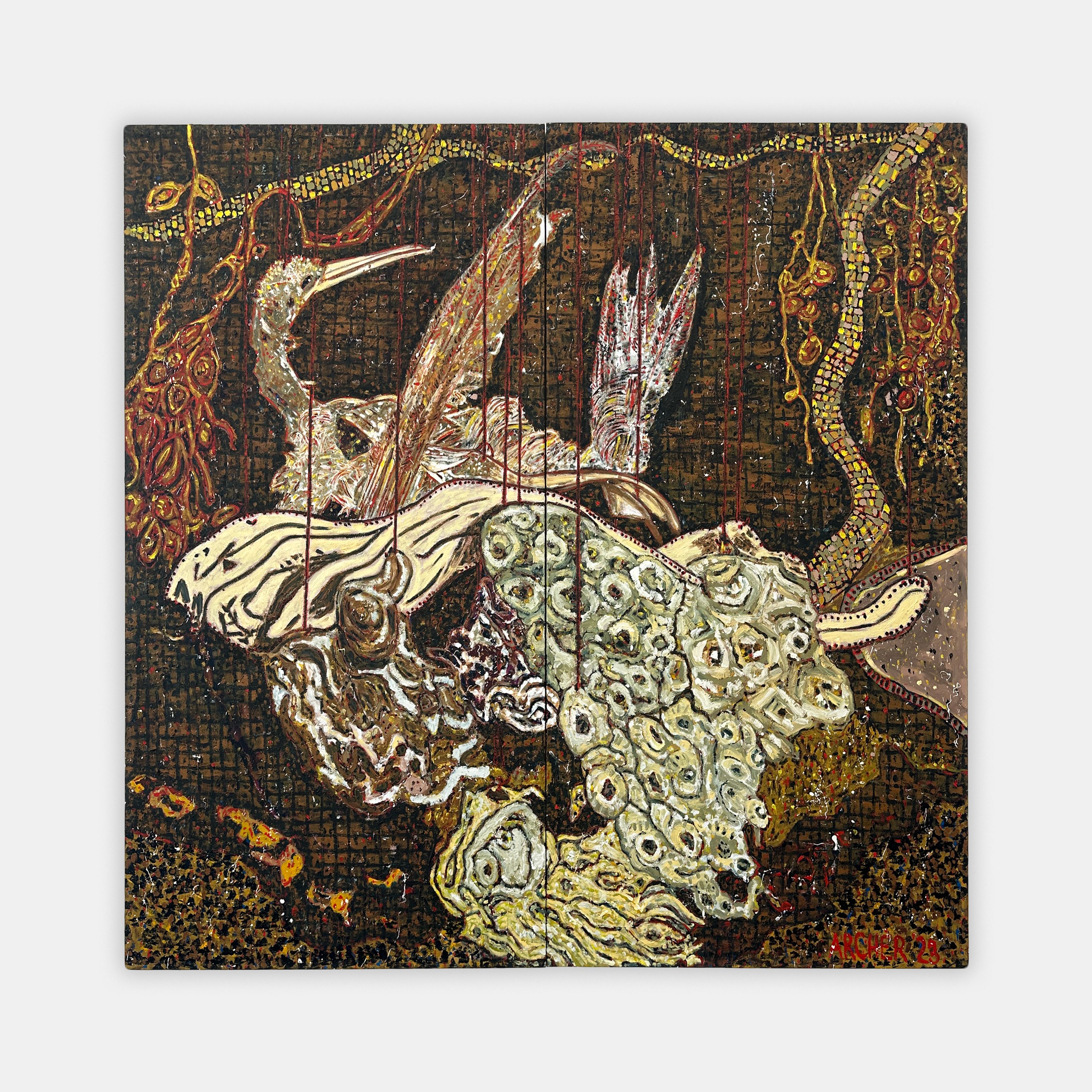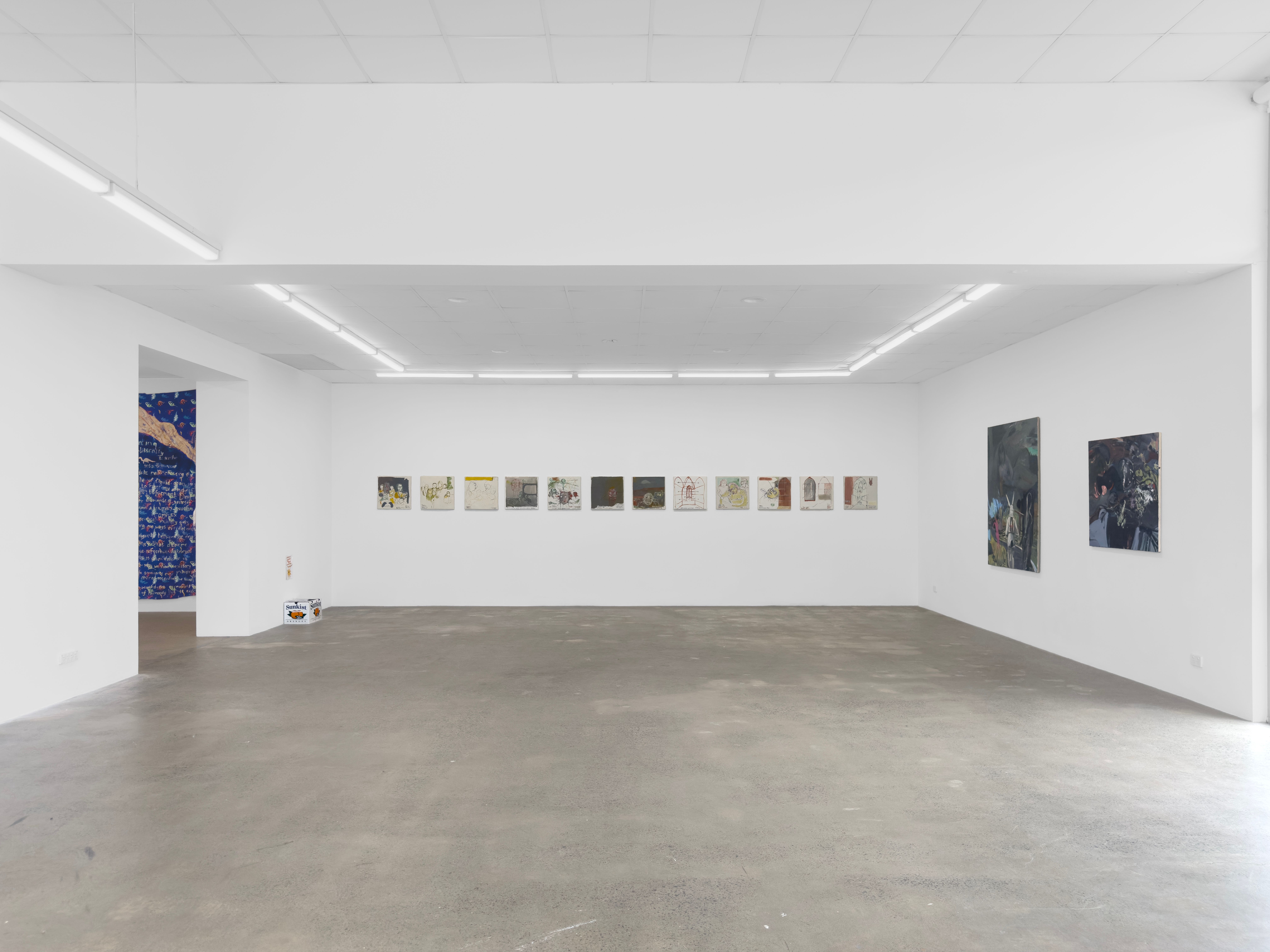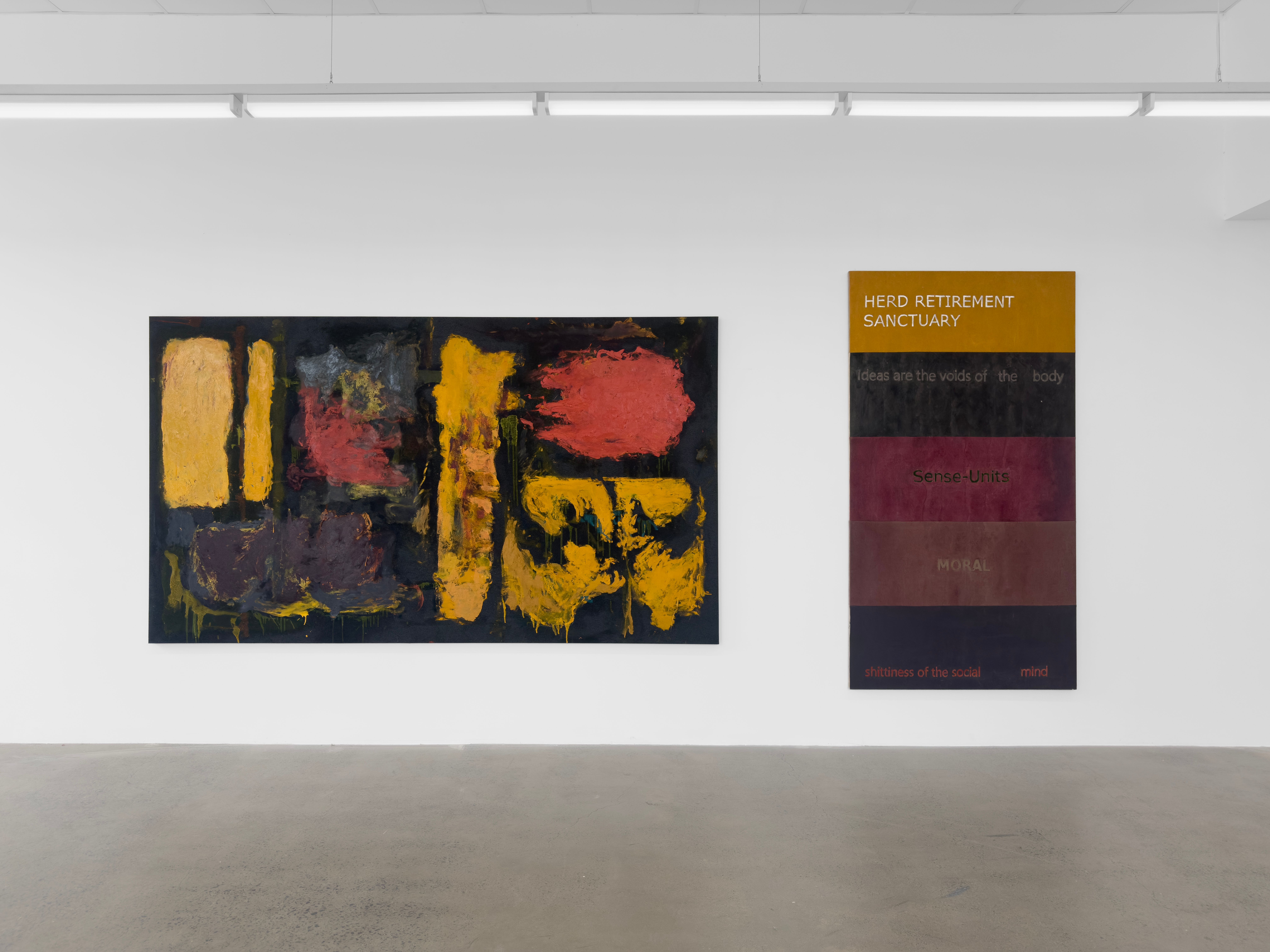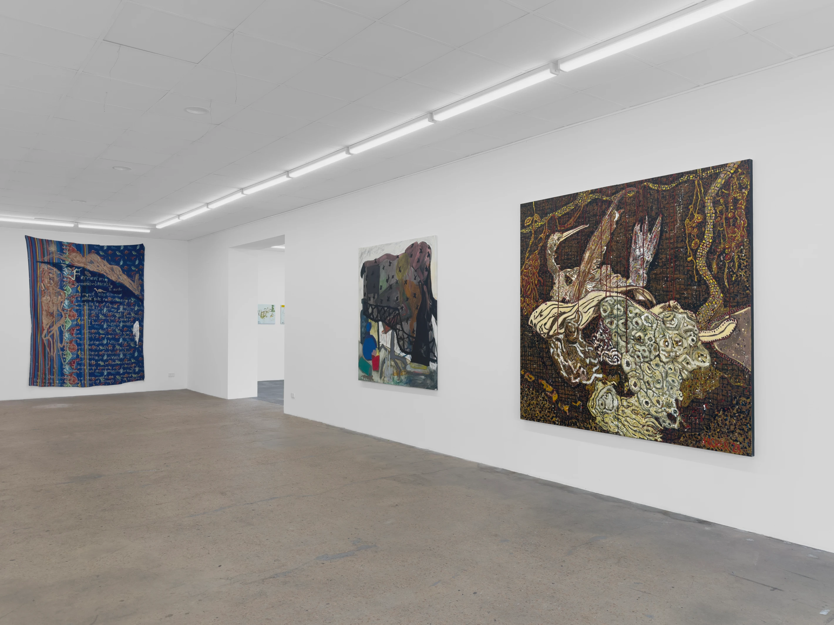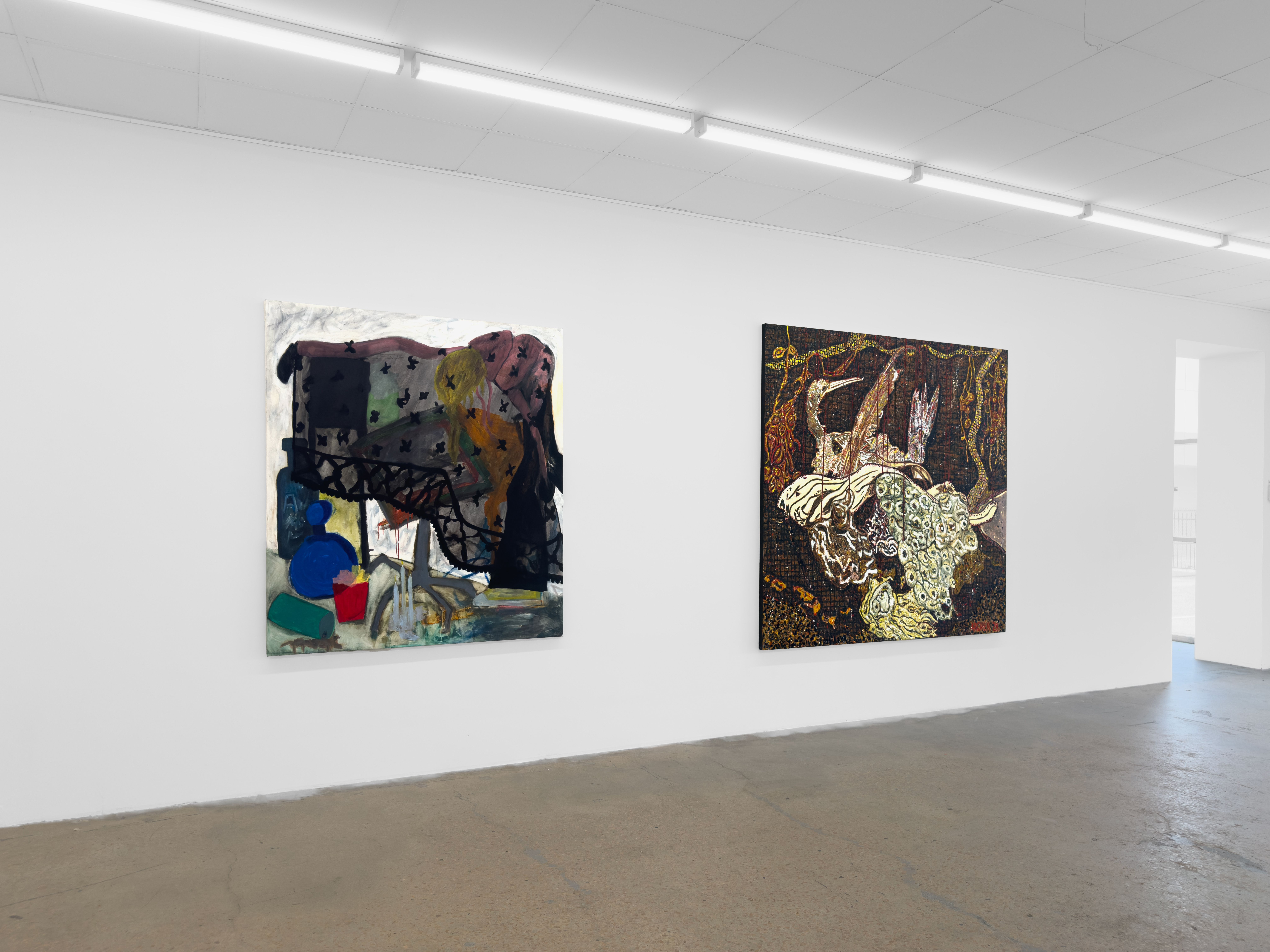 Replete with imaginal mash-ups, spiritual meanderings, and clustered abstractions, the works in “The Elephant Table Exhibition” collide and tangle up in networks of painterly impulse. While there exists no singular connective tissue, there are subtle branches between each oeuvre that serve as points of resonance–from diaristic meanderings to subcultural recapitulations.