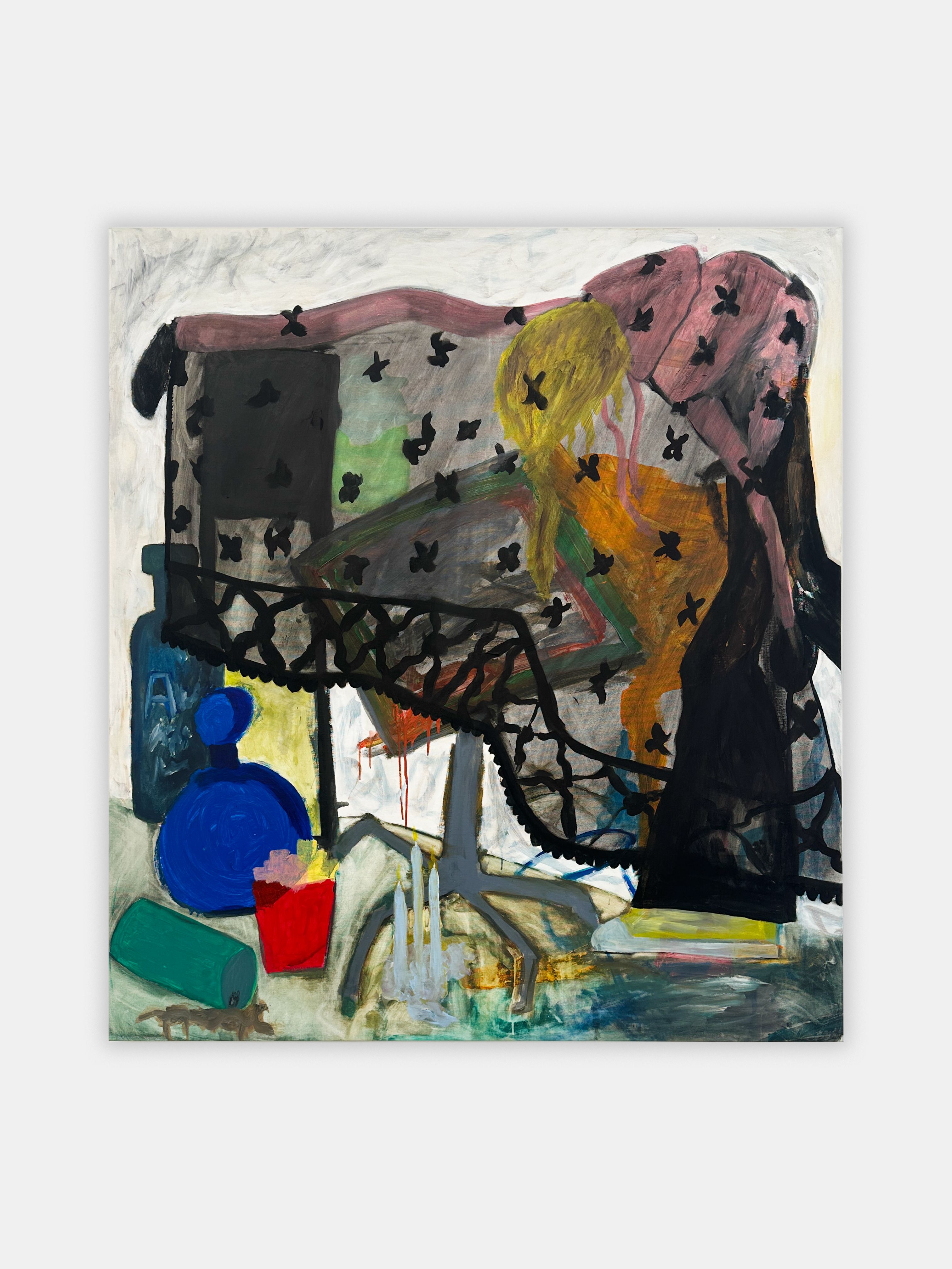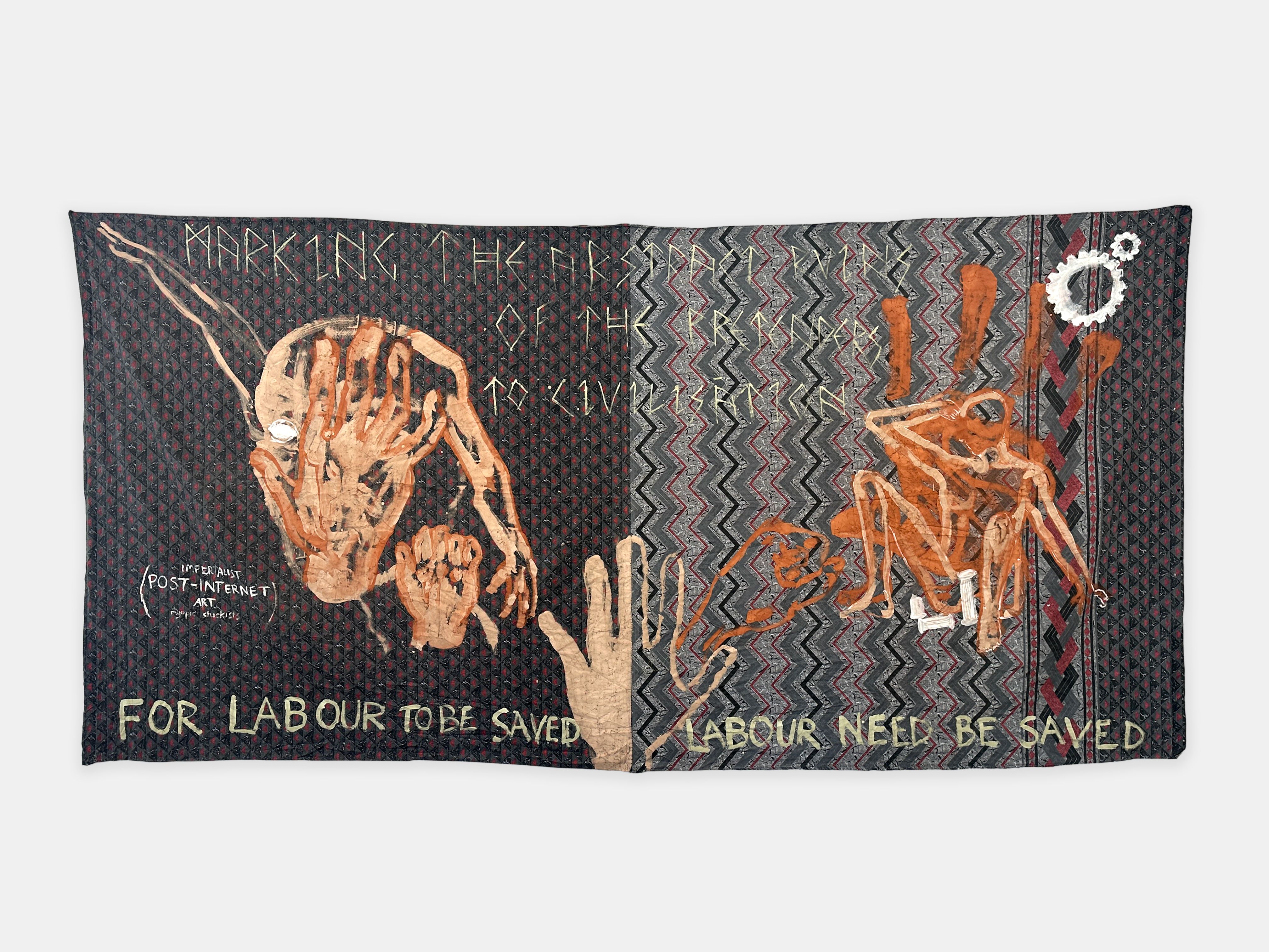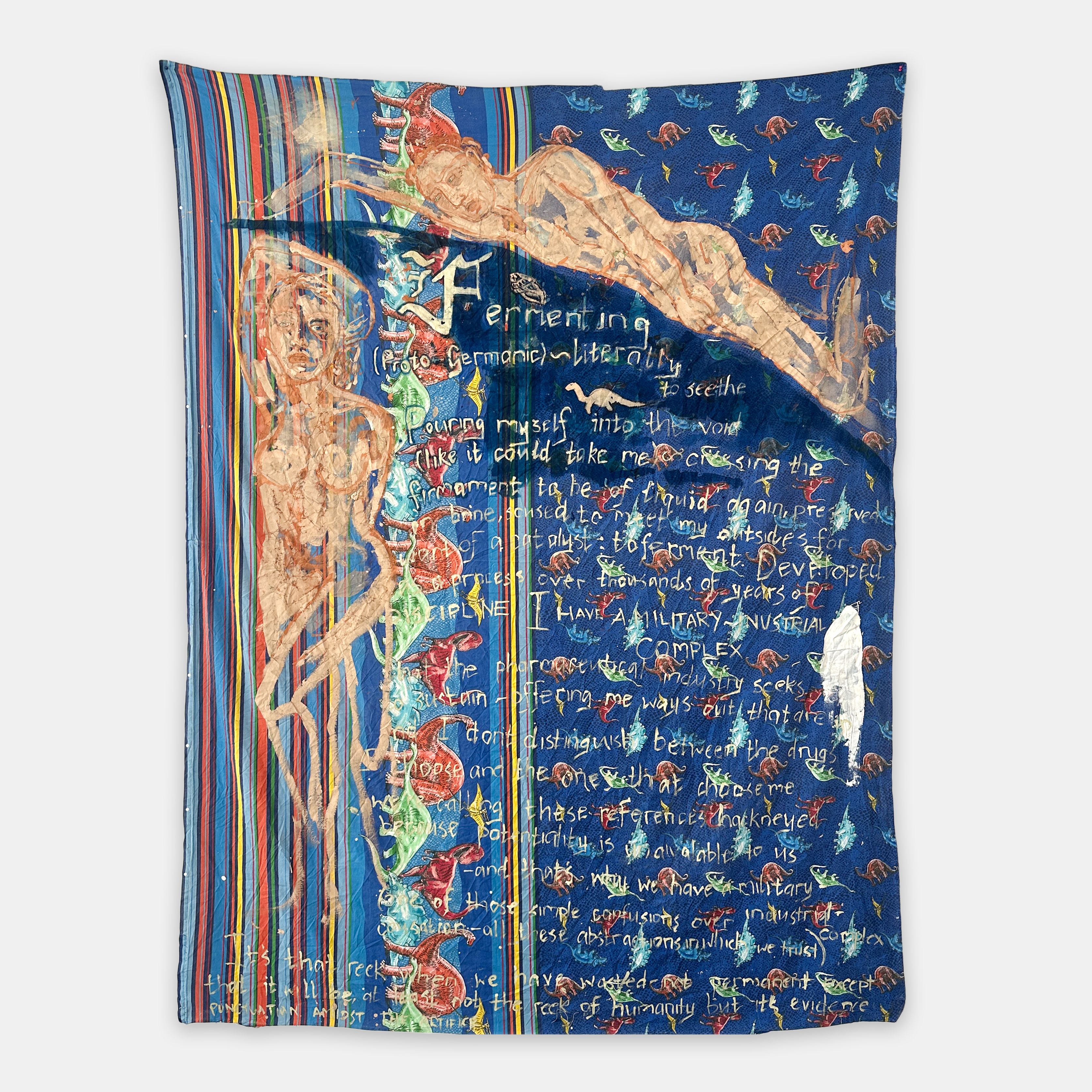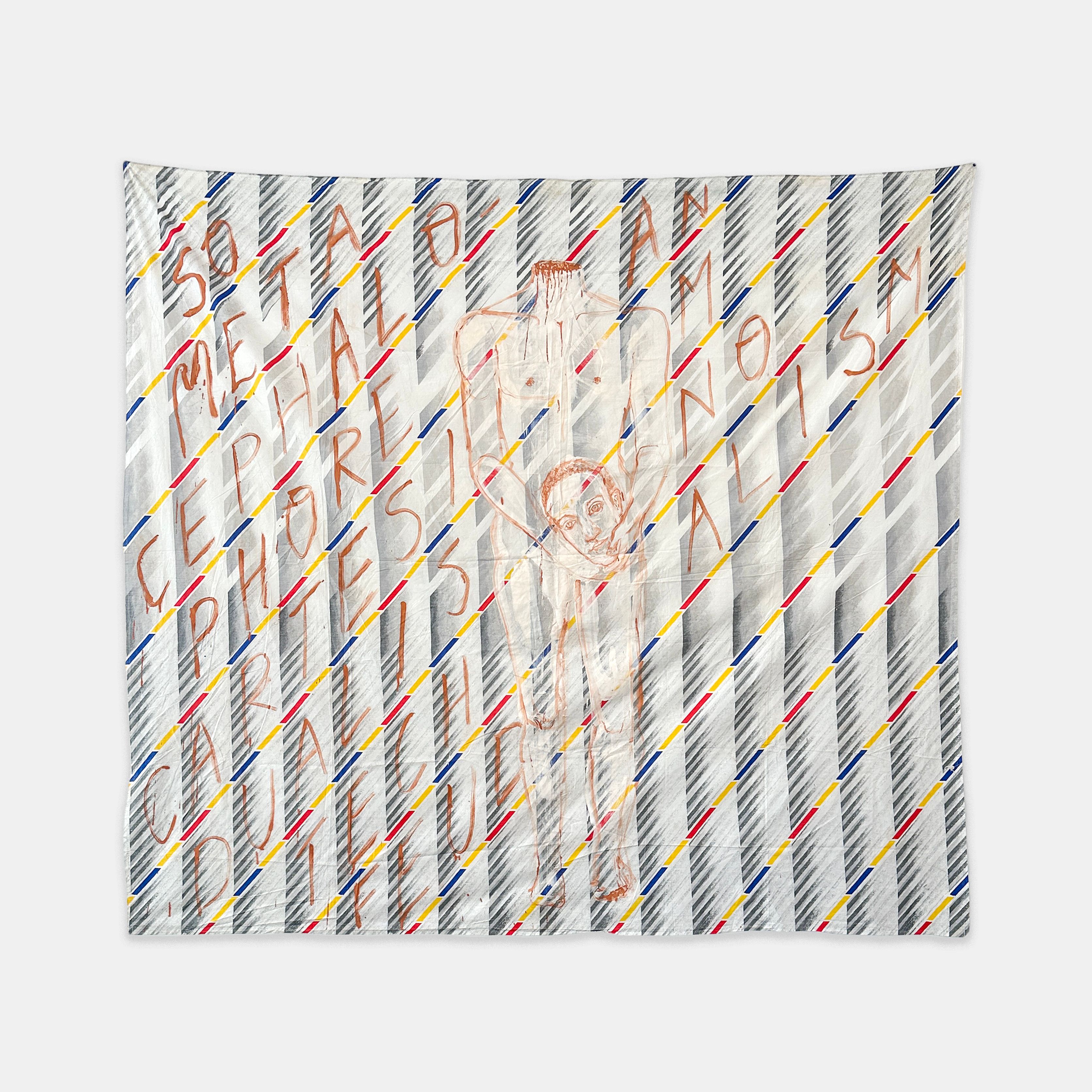 Two works plucked from Zoe Marni Robertson’s “Various Protest Banners" series serve as strong examples of the artist’s investments in politics, sustainability, and painting’s history. Here, she wrestles with the labor of building a composition and how the final form might stand as an act of resistance. Marni Robertson inherits the patterns of these bedsheets, an effort that recalls Sigmar Polke’s “Stoffbilder” series, in which found textiles provide support as image, reference to commercial manufacture, and a nod toward the domestic. She indulges the rawness of the material and its inherited patterns as a means to buck the weirdness of technocracy. Meaning—the ultimate world for Marni Robertson is one that can be felt. It’s wrought with a dimensionality unbeknownst to the digital space. Textures of yesteryear are reupholstered to demonstrate the merit of being-in-space.