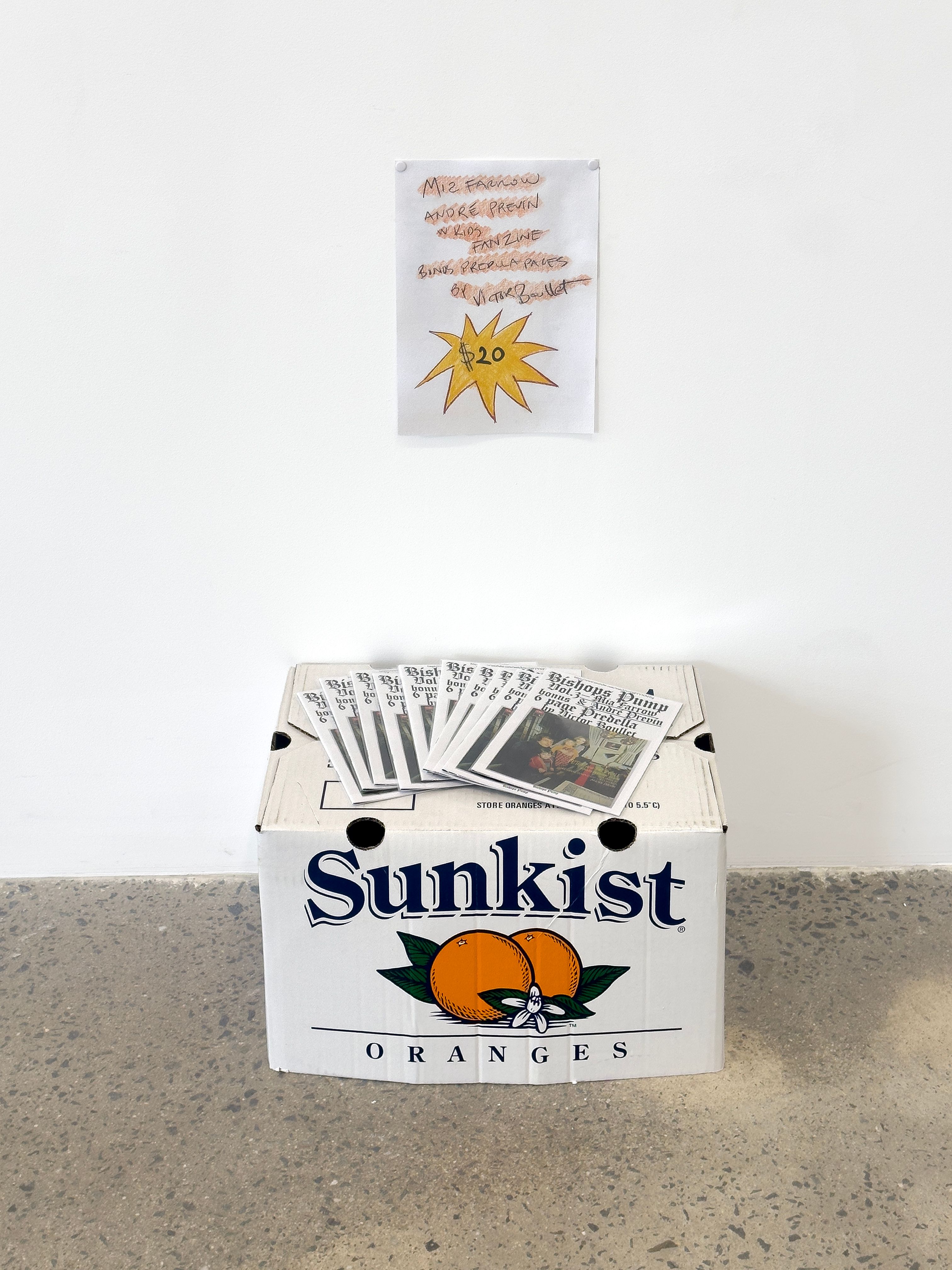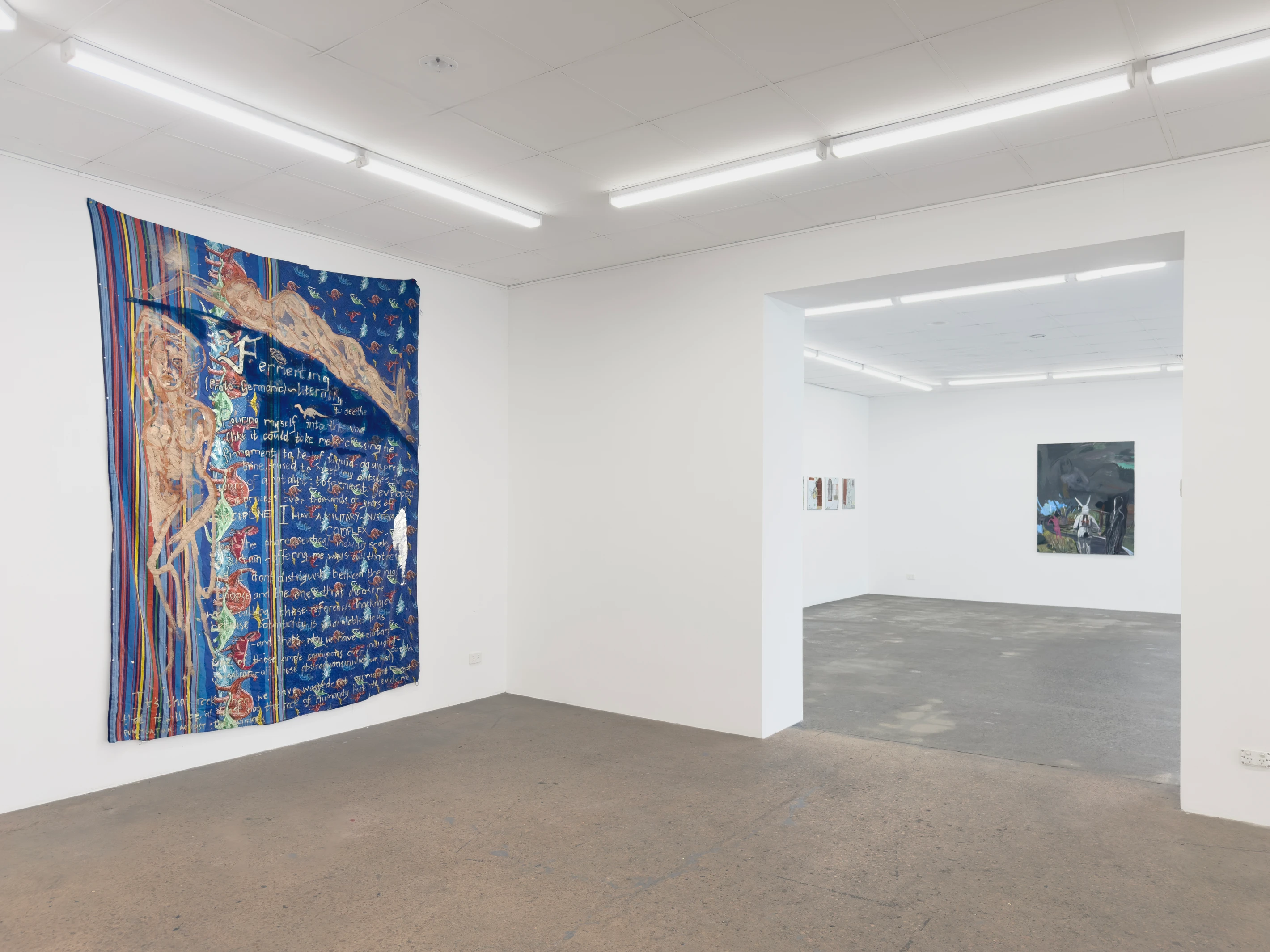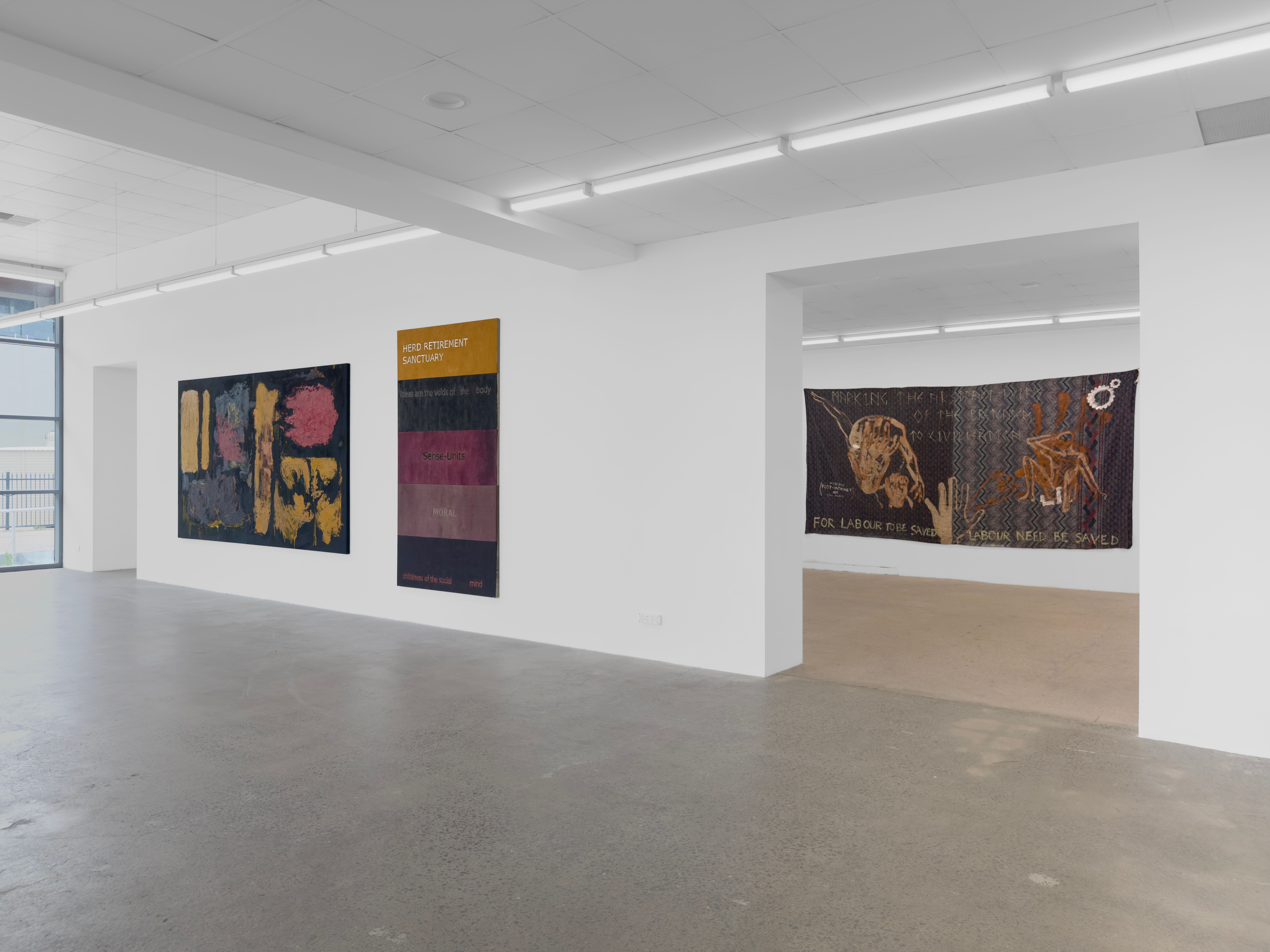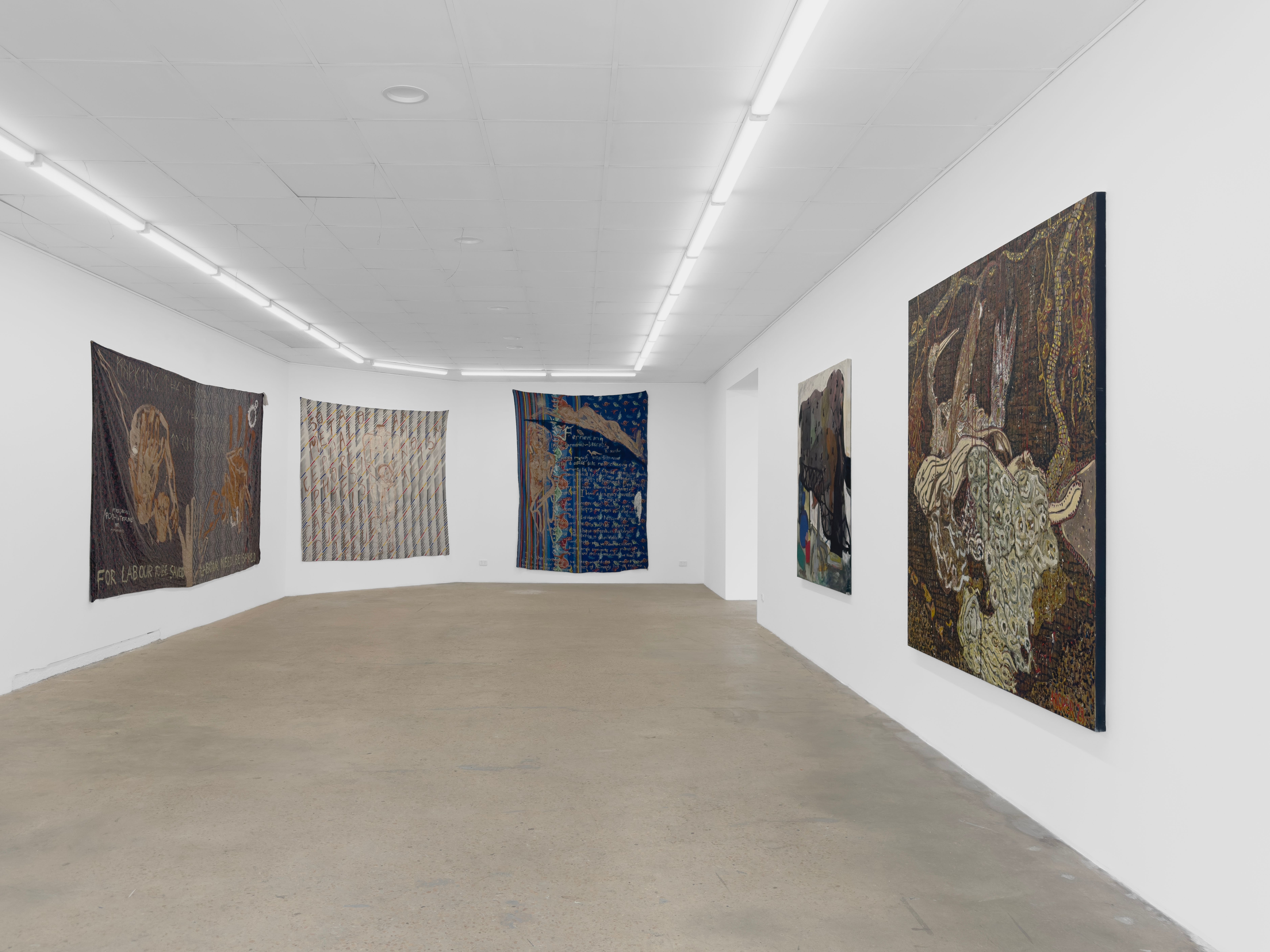 Two works plucked from Zoe Marni Robertson’s “Various Protest Banners" series serve as strong examples of the artist’s investments in politics, sustainability, and painting’s history. Here, she wrestles with the labor of building a composition and how the final form might stand as an act of resistance. Marni Robertson inherits the patterns of these bedsheets, an effort that recalls Sigmar Polke’s “Stoffbilder” series, in which found textiles provide support as image, reference to commercial manufacture, and a nod toward the domestic. She indulges the rawness of the material and its inherited patterns as a means to buck the weirdness of technocracy. Meaning—the ultimate world for Marni Robertson is one that can be felt. It’s wrought with a dimensionality unbeknownst to the digital space. Textures of yesteryear are reupholstered to demonstrate the merit of being-in-space.