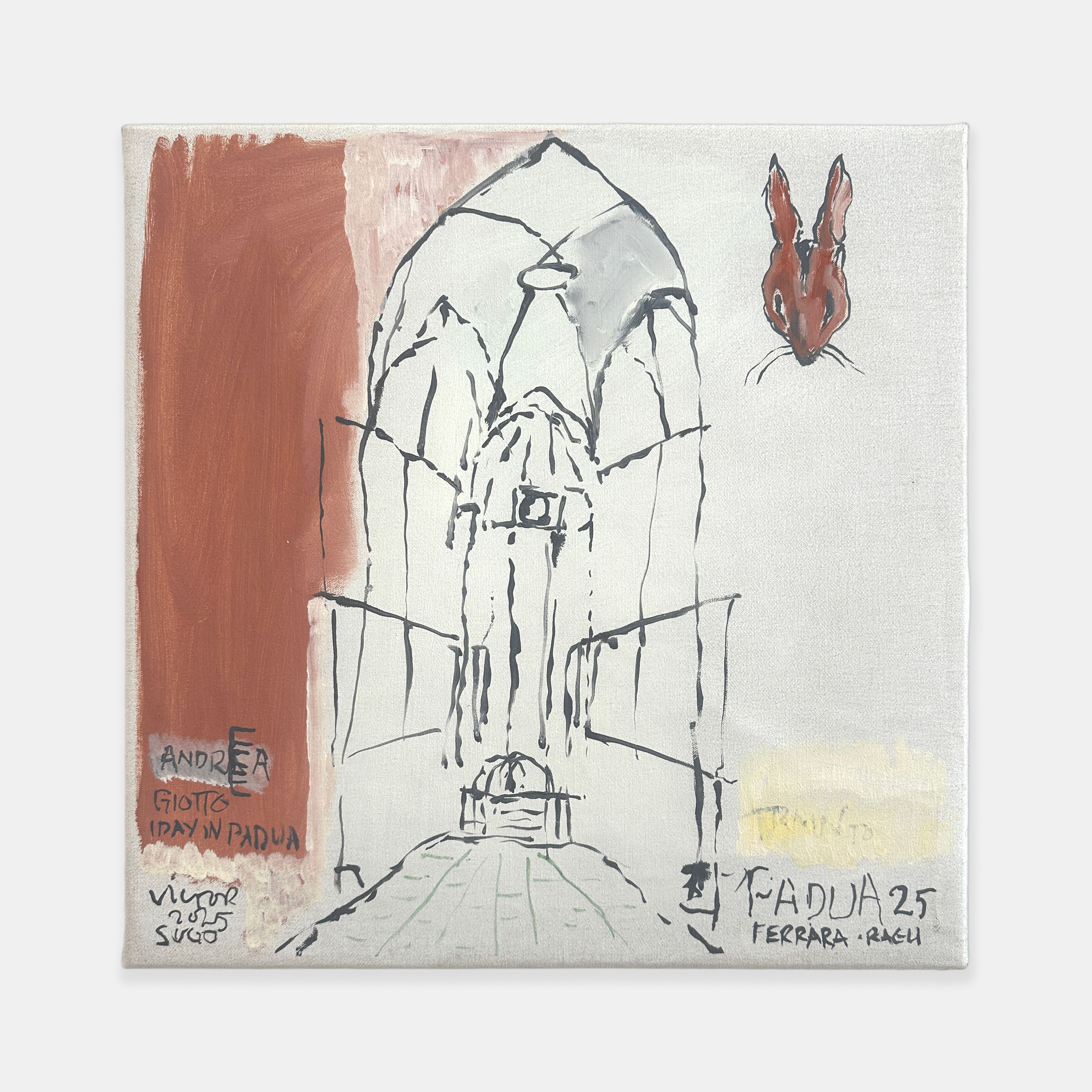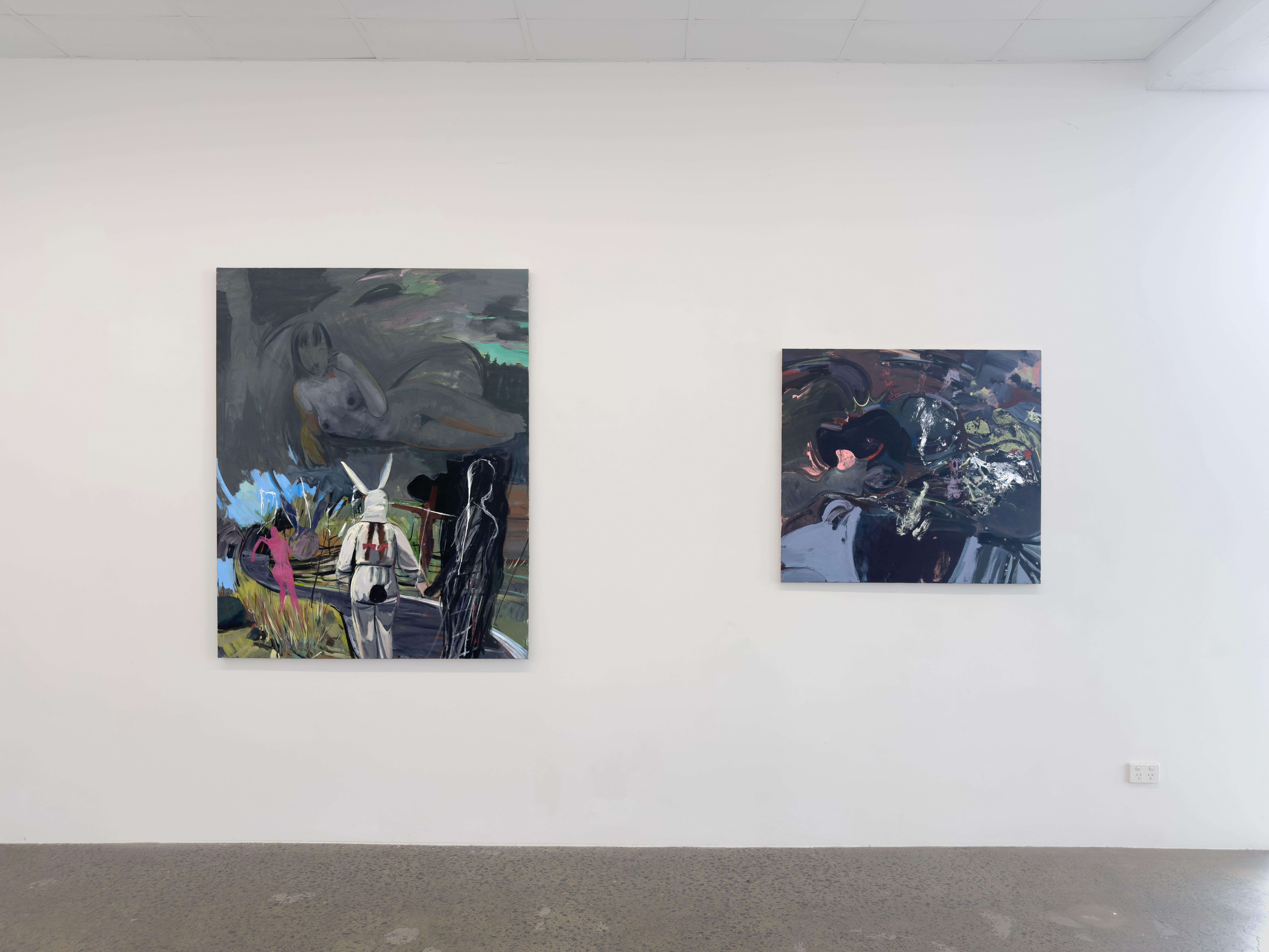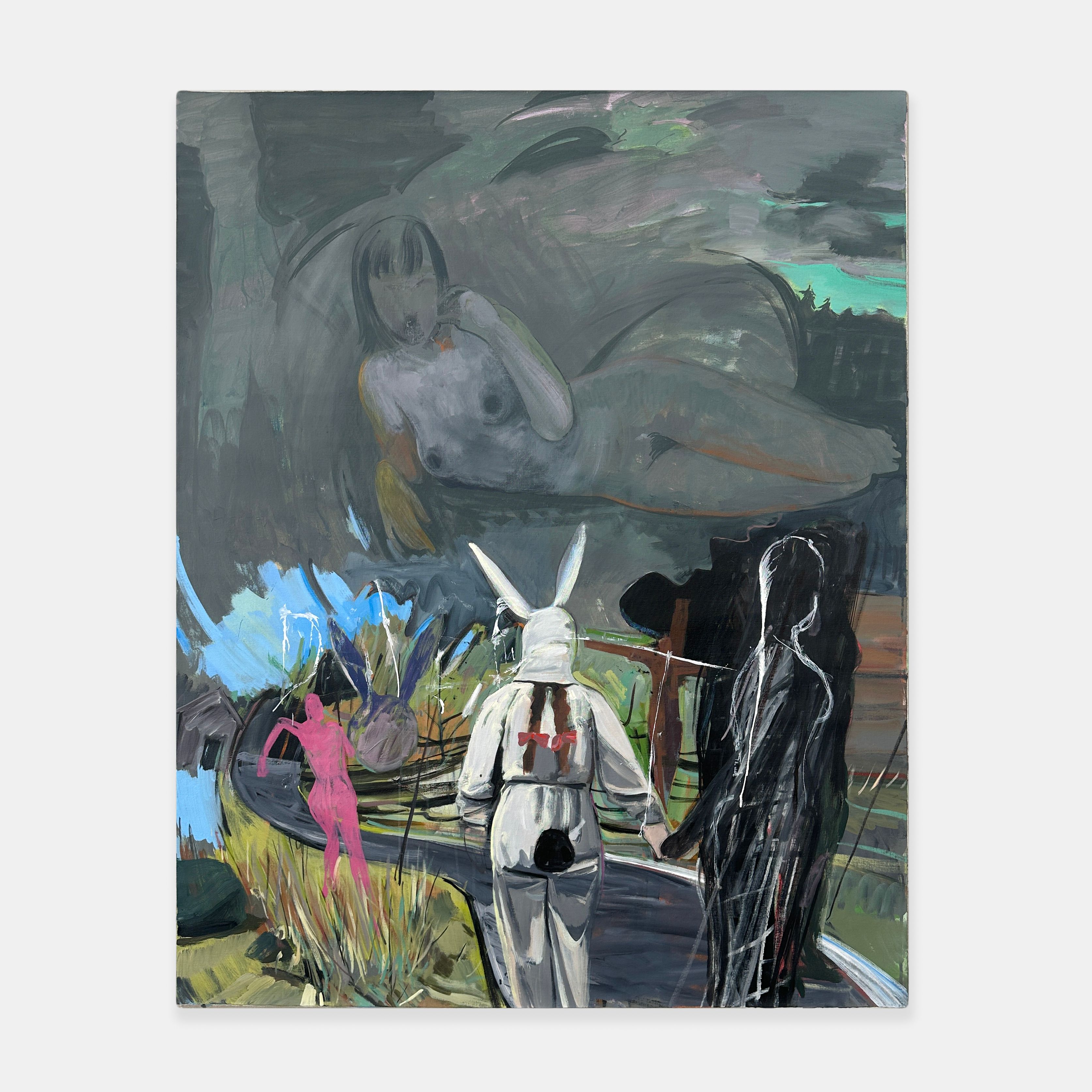 Two new paintings by Christine Burgon operate as continuations of her amalgamated referentialpursuits. In Mad Season a bunny suited figure leads a sketched out form along some ambiguous path. Upon further inspection, new elements start to reveal themselves. For instance, a crucifixion is staged at the roadside and another bunny form lingers just beyond it. The image’s top half is occupied by a subject in recline, which serves as an interruption to the bucolic lower scene. Interior and exterior are folded into one, accented by scattered gestural and nonobjective marks. Another painting, titled I Need Your Life, was completed at the same time. Fittingly, its palette is compatible to that of Mad Season, though here Burgon mostly clings to abstraction. The multimedia composition is a collage of nearly there forms like a smiling dog head, rotating angels, and Mickey Mouse alongside total non-representational expanses. The painter is questioning how much the subject matter should be articulated, and where it can slip into pigmental oblivion.