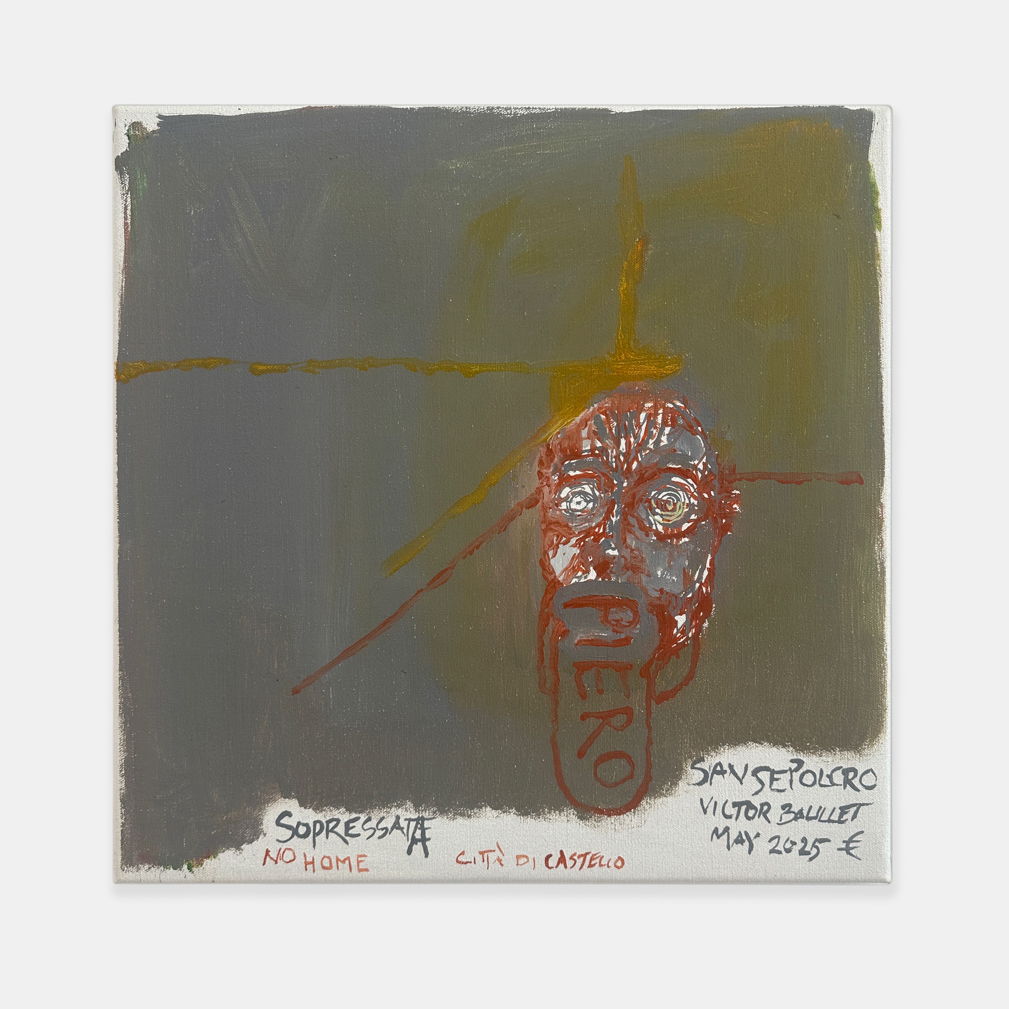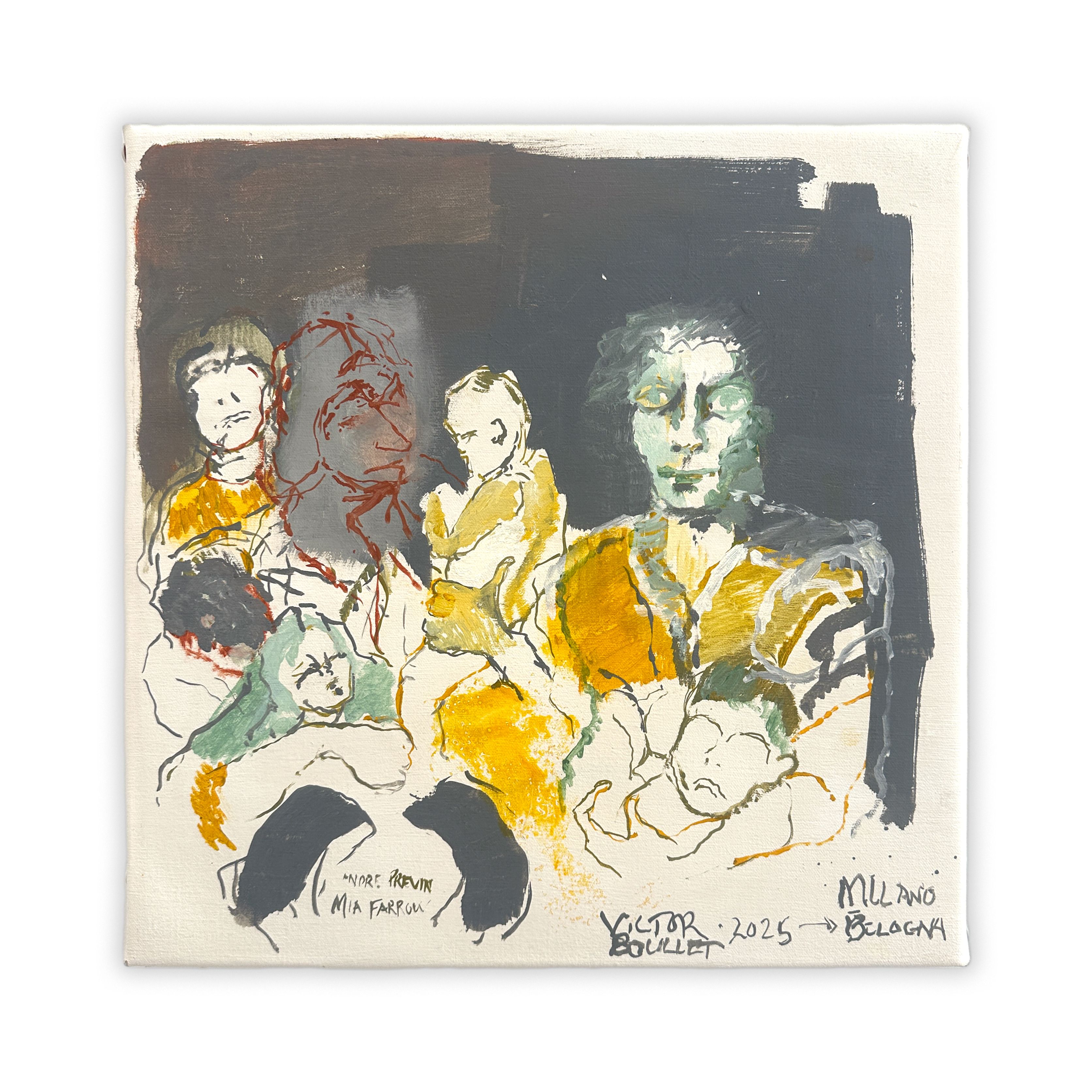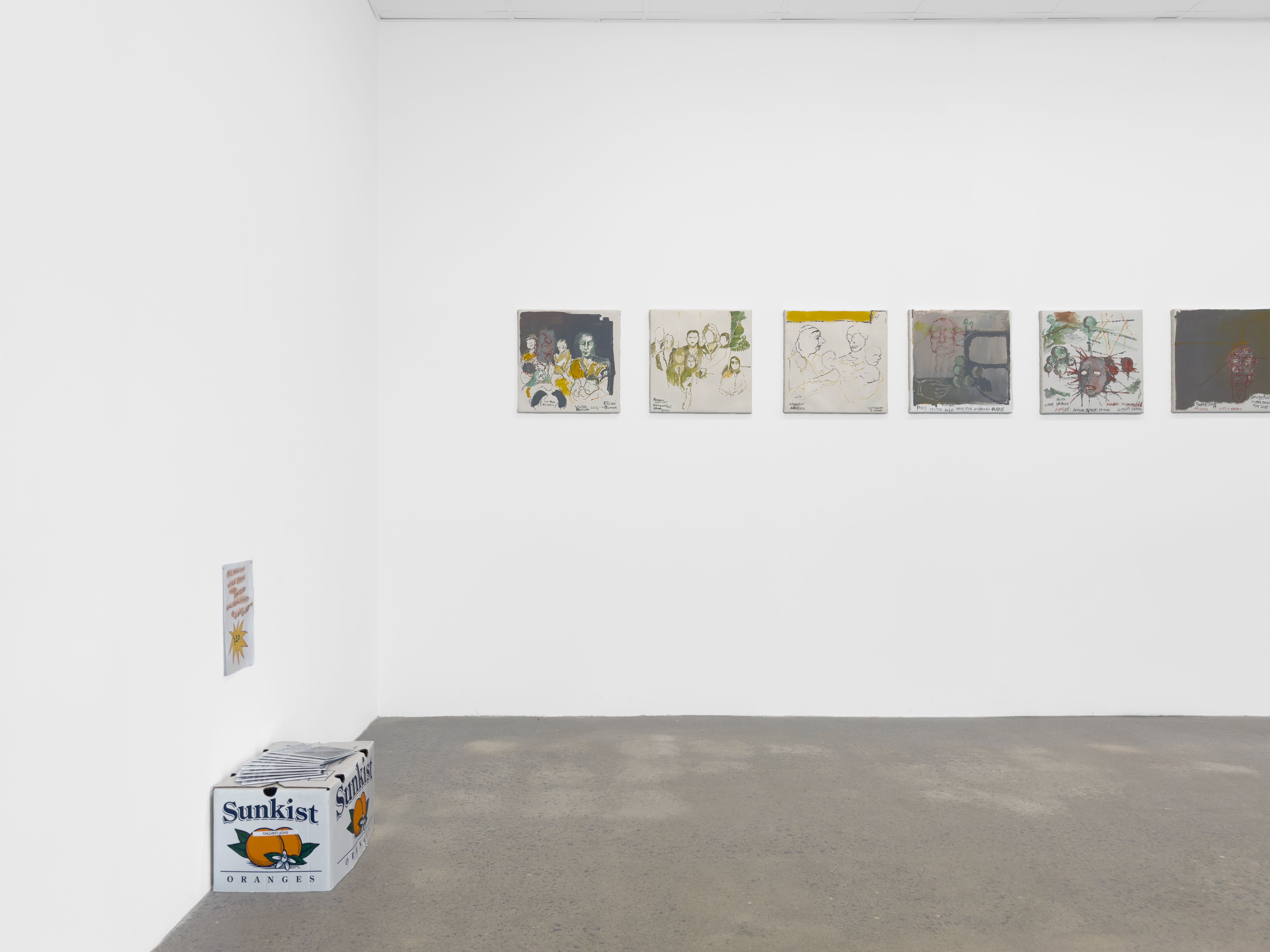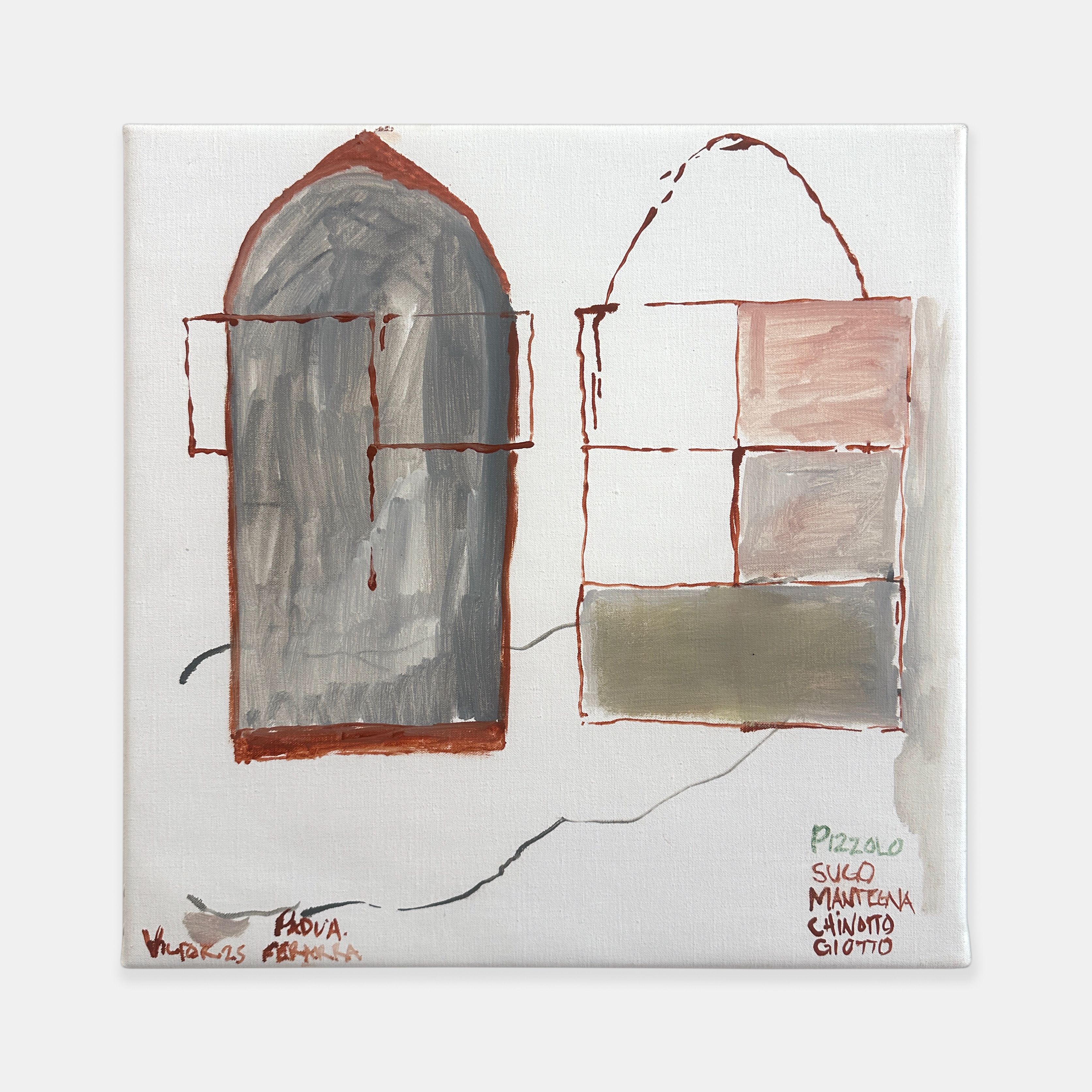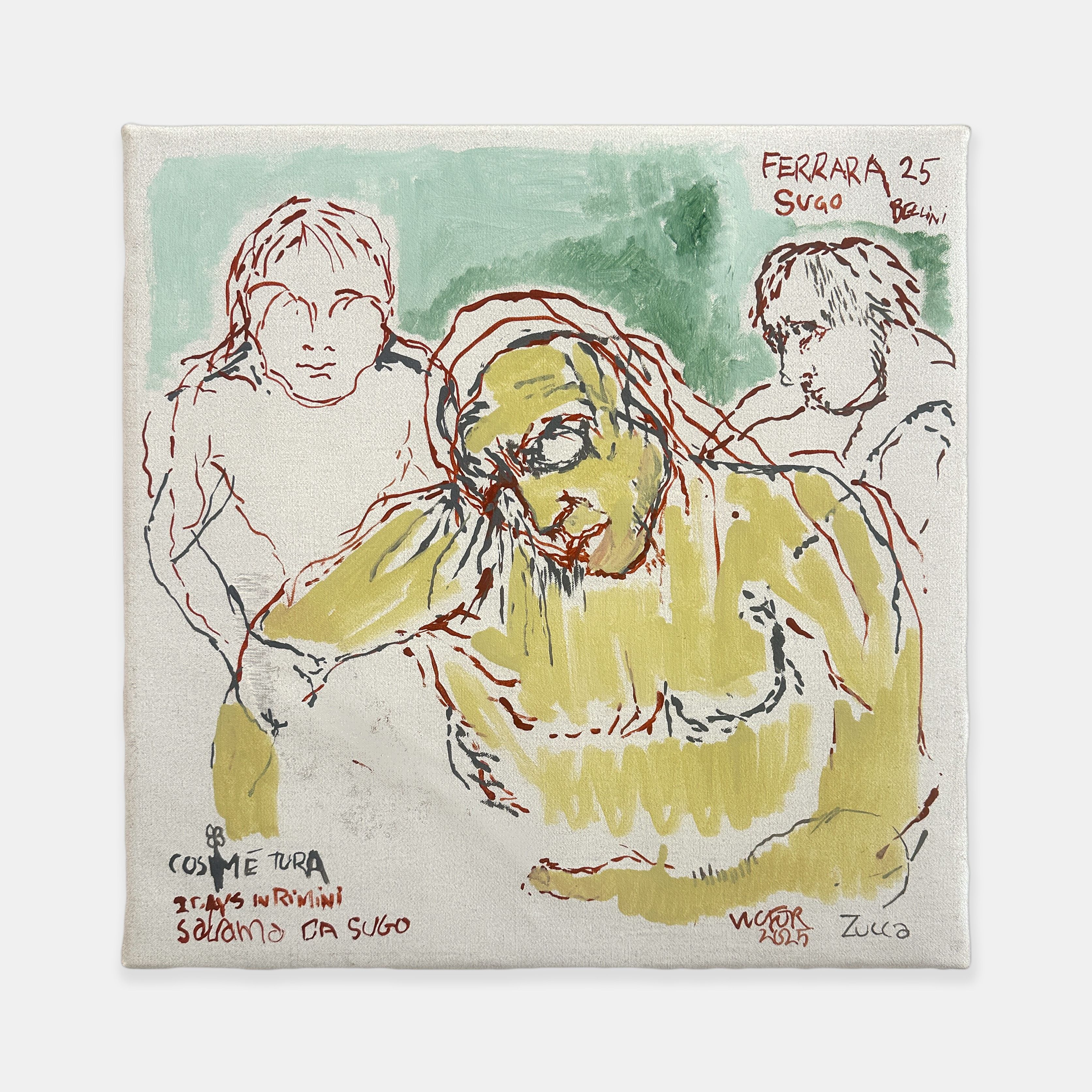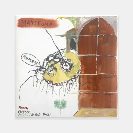 Victor Boullet also swoops in on the semi-representational front. Paintings from a recent series fall right in line with the artist’s knack for splintered compositional structures, as he pools together resources from his world and those from history. To spark a new body of work, there needs to be an “in,” or, and access point through which Boullet can then take over and flood the canvas with his subjective frequencies. For this particular compositional sequence, Mia Farrow and André Previn’s relationship and children are the root. Taken together, abstracted, and then expanded upon, these conditions are converted by Boullet into raw material available for distortion. Formally, the work has gotten looser, with threads of the artist’s drawing practice filtering in–mistakes and all. A recent pilgrimage across Italy manifests itself in textual scrawlings, aspects from historical artworks, and architectural elements from the The Renaissance homeland.