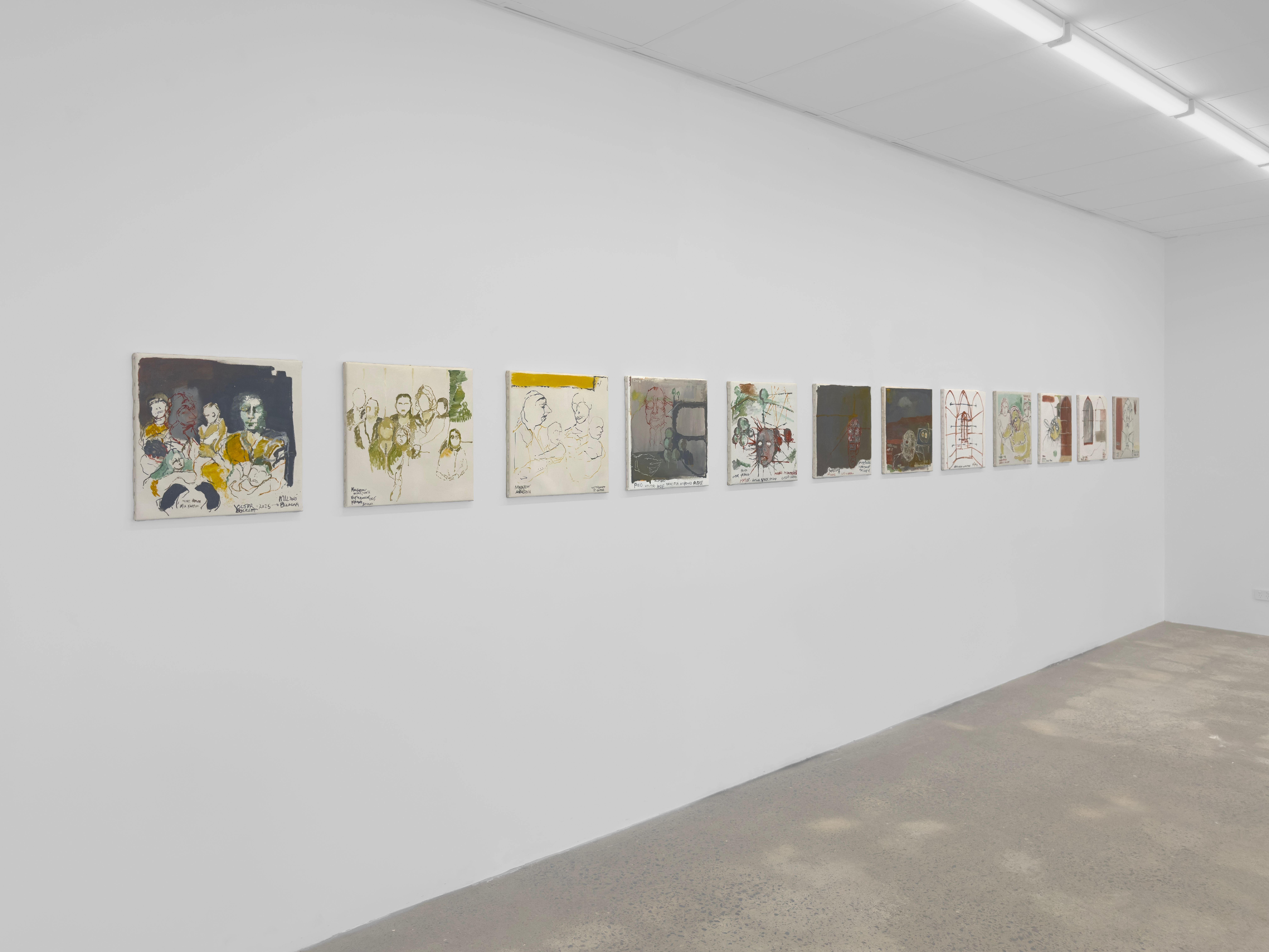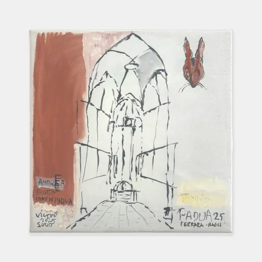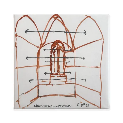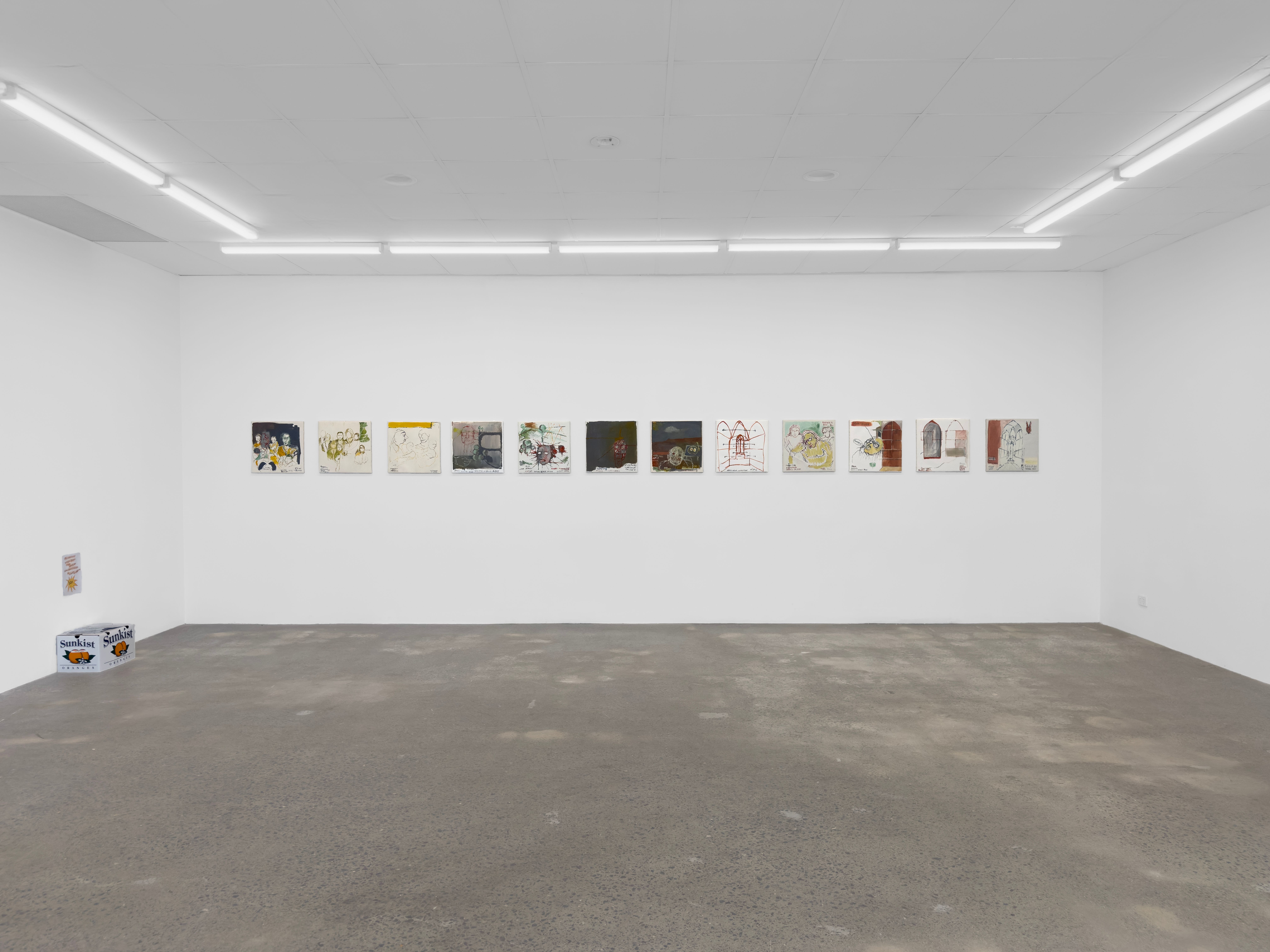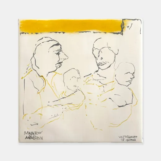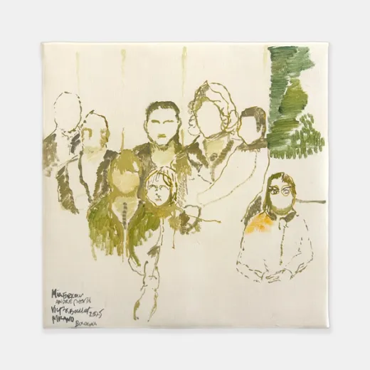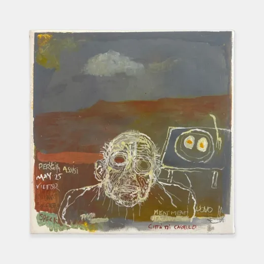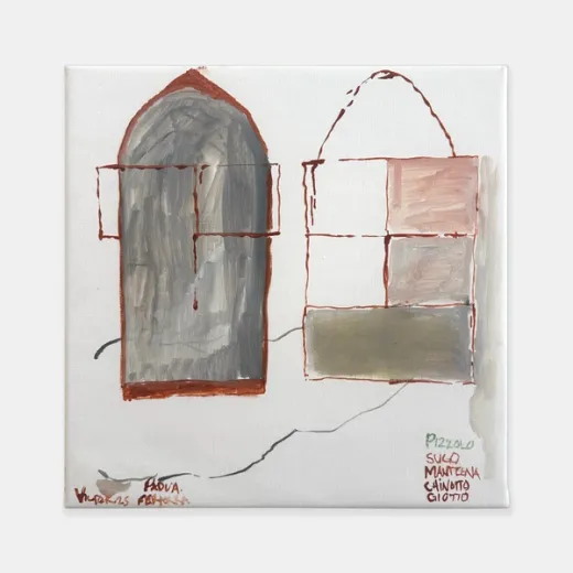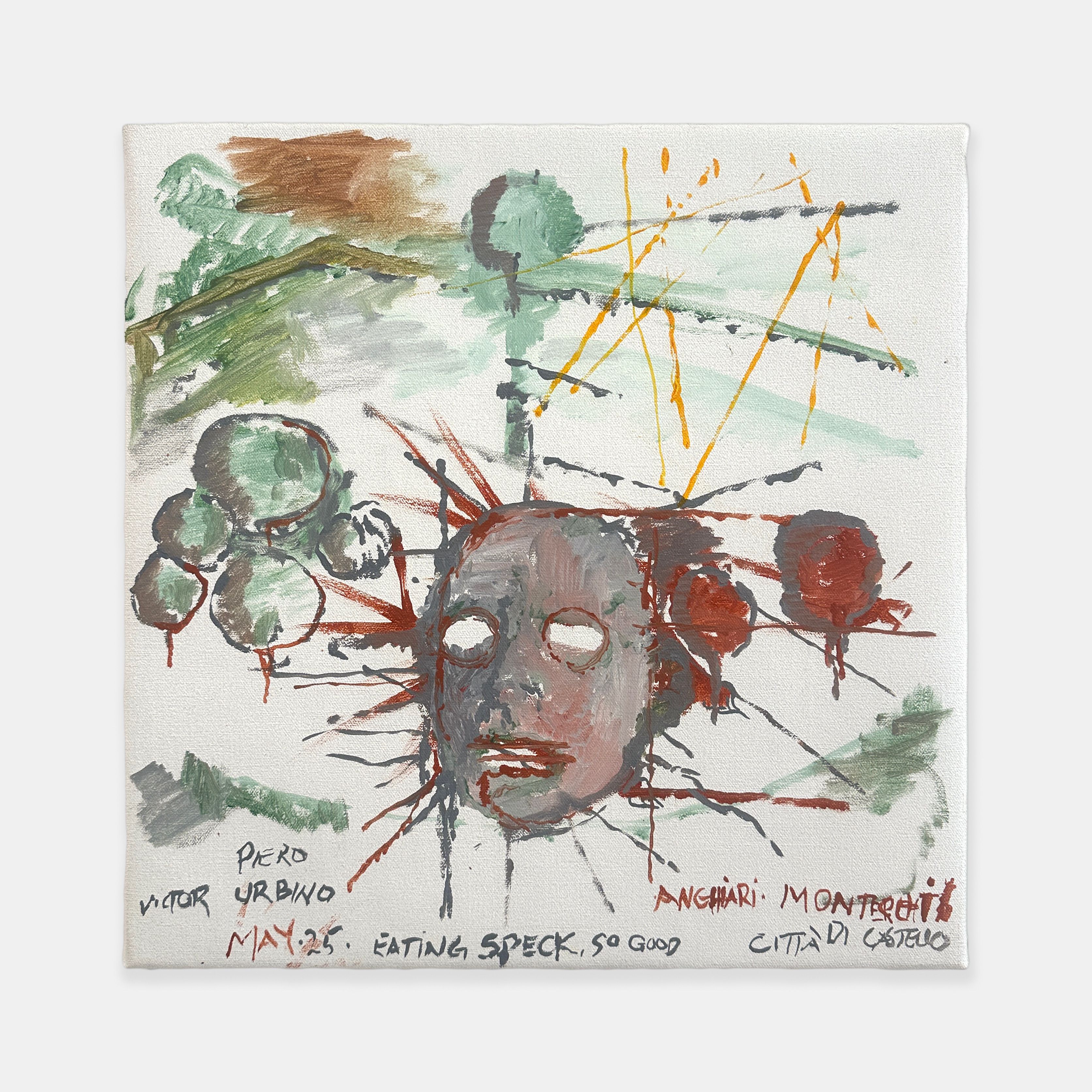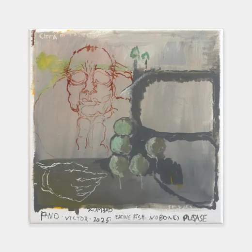 Victor Boullet also swoops in on the semi-representational front. Paintings from a recent series fall right in line with the artist’s knack for splintered compositional structures, as he pools together resources from his world and those from history. To spark a new body of work, there needs to be an “in,” or, and access point through which Boullet can then take over and flood the canvas with his subjective frequencies. For this particular compositional sequence, Mia Farrow and André Previn’s relationship and children are the root. Taken together, abstracted, and then expanded upon, these conditions are converted by Boullet into raw material available for distortion. Formally, the work has gotten looser, with threads of the artist’s drawing practice filtering in–mistakes and all. A recent pilgrimage across Italy manifests itself in textual scrawlings, aspects from historical artworks, and architectural elements from the The Renaissance homeland.
