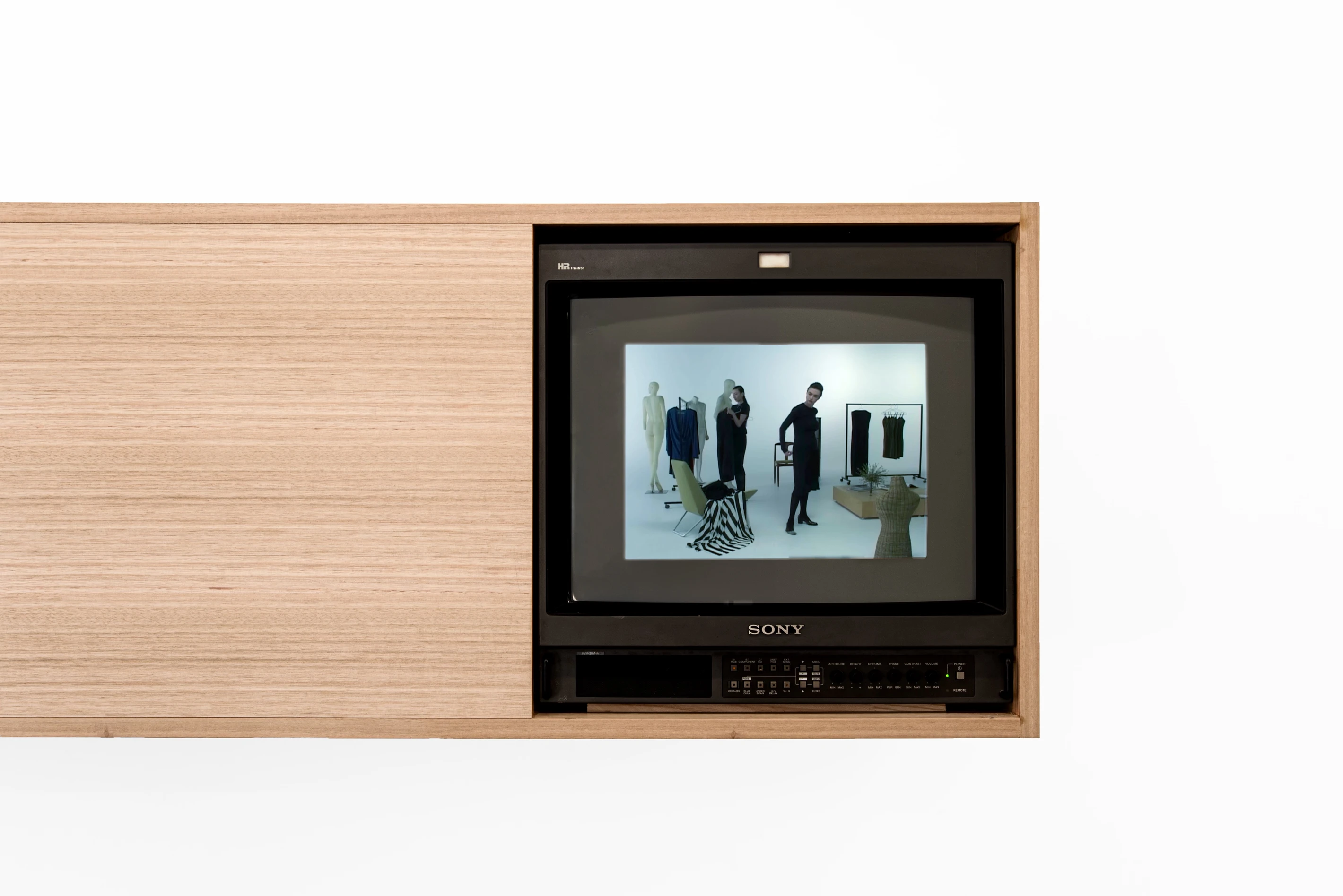 Amorous Envy is the name of the lipstick worn by the shop assistant in Tim Hardy’s short film, Vanity Torso Animal Spirit. “It really suits you,” says the shopper in the dialogue that shifts power and seduction between the two women; a back and forth of compliments, coy invitation and false refutation. At one point the two women look towards us, just right of the camera, as though at a changing room mirror; at themselves and each other in a Persona-like telescoping. A ‘whirligig’ is how Jean-Paul Satre describes the binding of appearance and reality mastered by Jean Genet; two poles spinning ever more tightly together. In his introduction to Genet’s twin plays, The Maids and Deathwatch, Satre describes the writer’s circular sophistry as a knowing indulgence in false reasoning. The artificiality of theatre is what attracts Genet to the form, and in The Maids he ushers in artifice by determining that men play the two maid characters, who play at being each other and play at being their mistress. In their game, the maids are always other than themselves and haunt one another with duality. Our intuition that when artifice falls away it reveals true being is taunted by Genet, who layers artifice on artifice to reveal nothingness. The shop assistant in Hardy’s film recalls the various hair colours she has had over the years, deciding what will come next in the long line of shifting appearances.