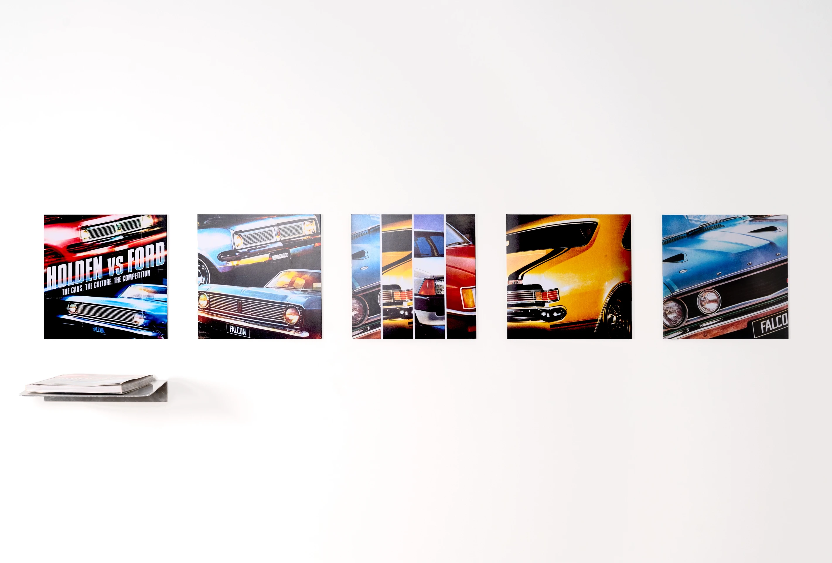 Book on aluminium shelf, digital print on aluminium (six elements including shelf with book)